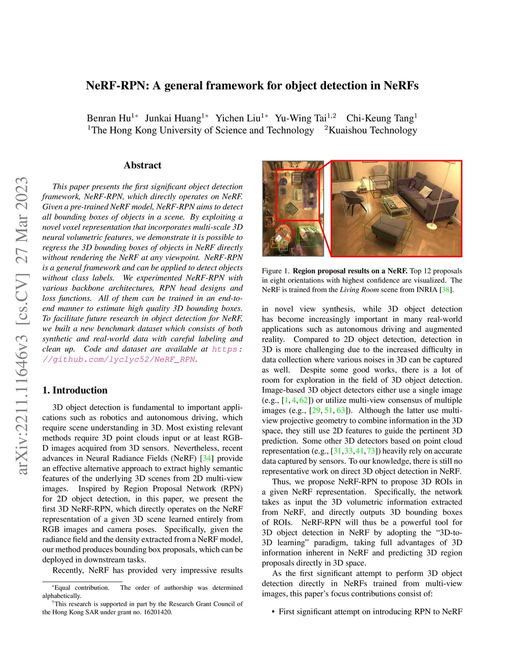 This paper presents the first significant object detection framework, NeRF-RPN, which directly operates on NeRF. Given a pre-trained NeRF model, NeRF-RPN aims to detect all bounding boxes of objects in a scene. By exploiting a novel voxel representation that incorporates multi-scale 3D neural volumetric features, we demonstrate it is possible to regress the 3D bounding boxes of objects in NeRF directly without rendering the NeRF at any viewpoint. NeRF-RPN is a general framework and can be applied to detect objects without class labels. We experimented NeRF-RPN with various backbone architectures, RPN head designs and loss functions. All of them can be trained in an end-to-end manner to estimate high quality 3D bounding boxes. To facilitate future research in object detection for NeRF, we built a new benchmark dataset which consists of both synthetic and real-world data with careful labeling and clean up. Code and dataset are available at https://github.com/lyclyc52/NeRF_RPN.