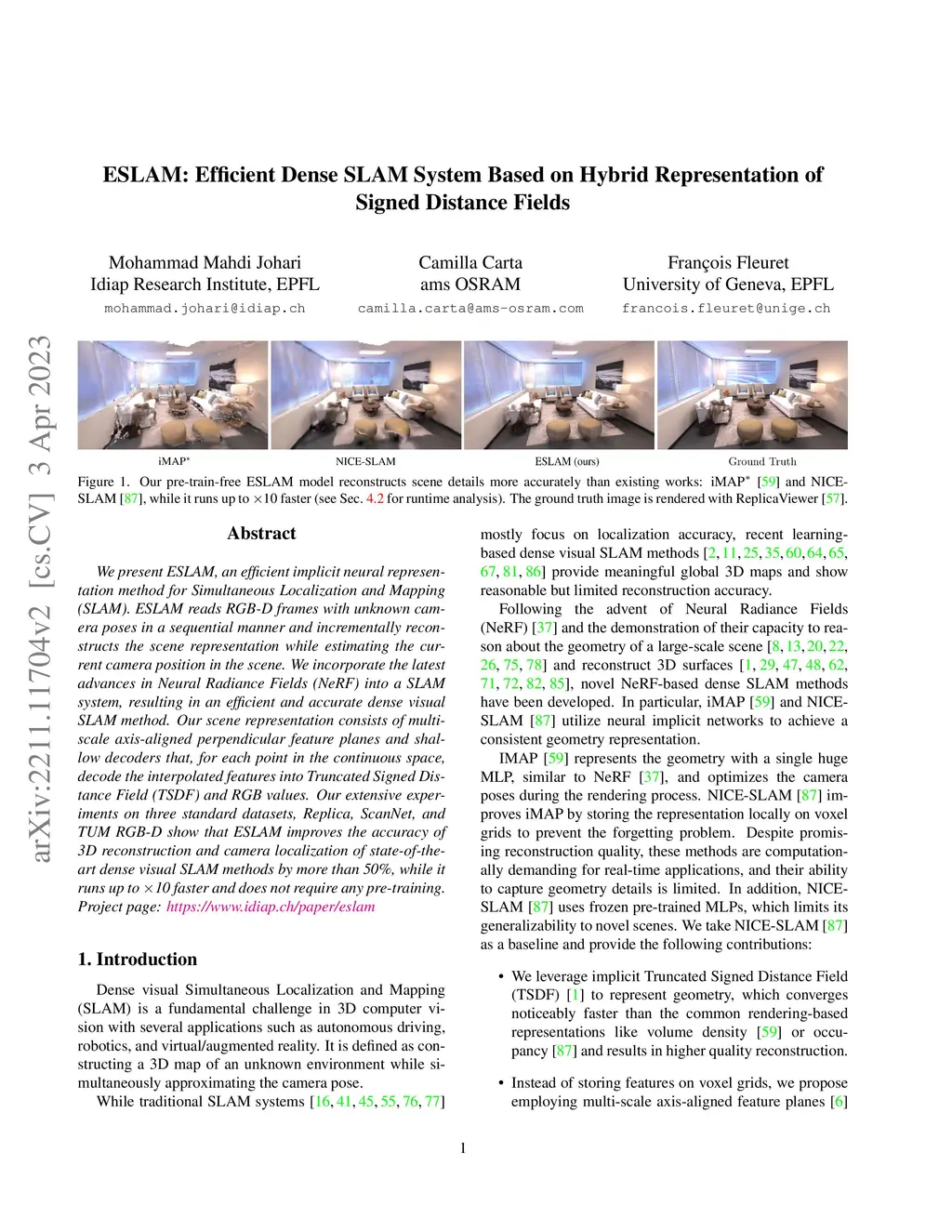We present ESLAM, an efficient implicit neural representation method for Simultaneous Localization and Mapping (SLAM). ESLAM reads RGB-D frames with unknown camera poses in a sequential manner and incrementally reconstructs the scene representation while estimating the current camera position in the scene. We incorporate the latest advances in Neural Radiance Fields (NeRF) into a SLAM system, resulting in an efficient and accurate dense visual SLAM method. Our scene representation consists of multi-scale axis-aligned perpendicular feature planes and shallow decoders that, for each point in the continuous space, decode the interpolated features into Truncated Signed Distance Field (TSDF) and RGB values. Our extensive experiments on three standard datasets, Replica, ScanNet, and TUM RGB-D show that ESLAM improves the accuracy of 3D reconstruction and camera localization of state-of-the-art dense visual SLAM methods by more than 50%, while it runs up to 10 times faster and does not require any pre-training.
