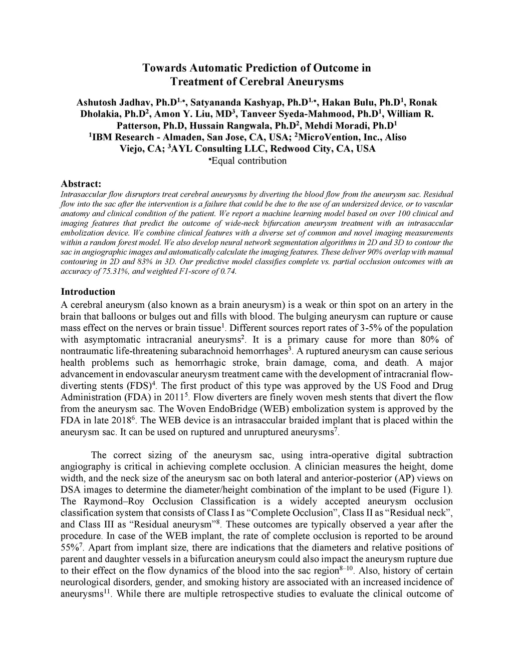 Intrasaccular flow disruptors treat cerebral aneurysms by diverting the blood flow from the aneurysm sac. Residual flow into the sac after the intervention is a failure that could be due to the use of an undersized device, or to vascular anatomy and clinical condition of the patient. We report a machine learning model based on over 100 clinical and imaging features that predict the outcome of wide-neck bifurcation aneurysm treatment with an intravascular embolization device. We combine clinical features with a diverse set of common and novel imaging measurements within a random forest model. We also develop neural network segmentation algorithms in 2D and 3D to contour the sac in angiographic images and automatically calculate the imaging features. These deliver 90% overlap with manual contouring in 2D and 83% in 3D. Our predictive model classifies complete vs. partial occlusion outcomes with an accuracy of 75.31%, and weighted F1-score of 0.74.
