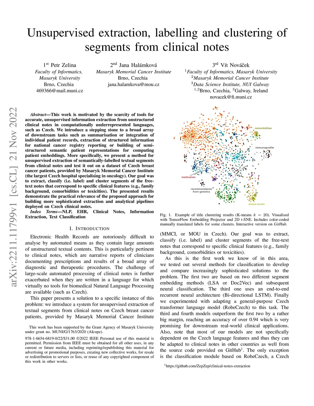 This work is motivated by the scarcity of tools for accurate, unsupervised information extraction from unstructured clinical notes in computationally underrepresented languages, such as Czech. We introduce a stepping stone to a broad array of downstream tasks such as summarisation or integration of individual patient records, extraction of structured information for national cancer registry reporting or building of semi-structured semantic patient representations for computing patient embeddings. More specifically, we present a method for unsupervised extraction of semantically-labelled textual segments from clinical notes and test it out on a dataset of Czech breast cancer patients, provided by Masaryk Memorial Cancer Institute (the largest Czech hospital specialising in oncology). Our goal was to extract, classify (i.e. label) and cluster segments of the free-text notes that correspond to specific clinical features (e.g., family background, comorbidities or toxicities). The presented results demonstrate the practical relevance of the proposed approach for building more sophisticated extraction and analytical pipelines deployed on Czech clinical notes.