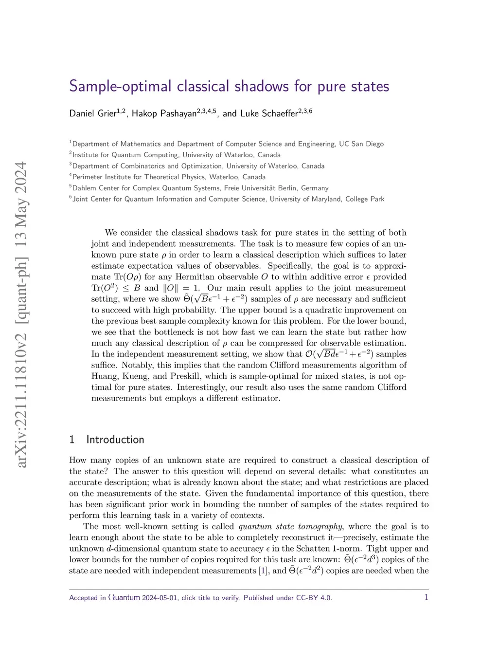 Sample-optimal classical shadows for pure states
