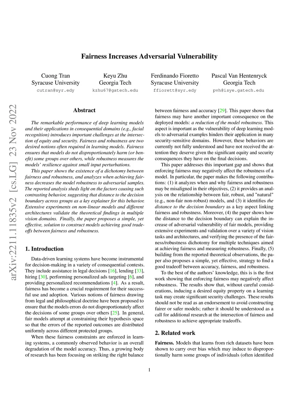 The remarkable performance of deep learning models and their applications in consequential domains (e.g., facial recognition) introduces important challenges at the intersection of equity and security. Fairness and robustness are two desired notions often required in learning models. Fairness ensures that models do not disproportionately harm (or benefit) some groups over others, while robustness measures the models' resilience against small input perturbations. This paper shows the existence of a dichotomy between fairness and robustness, and analyzes when achieving fairness decreases the model robustness to adversarial samples. The reported analysis sheds light on the factors causing such contrasting behavior, suggesting that distance to the decision boundary across groups as a key explainer for this behavior. Extensive experiments on non-linear models and different architectures validate the theoretical findings in multiple vision domains. Finally, the paper proposes a simple, yet effective, solution to construct models achieving good tradeoffs between fairness and robustness.