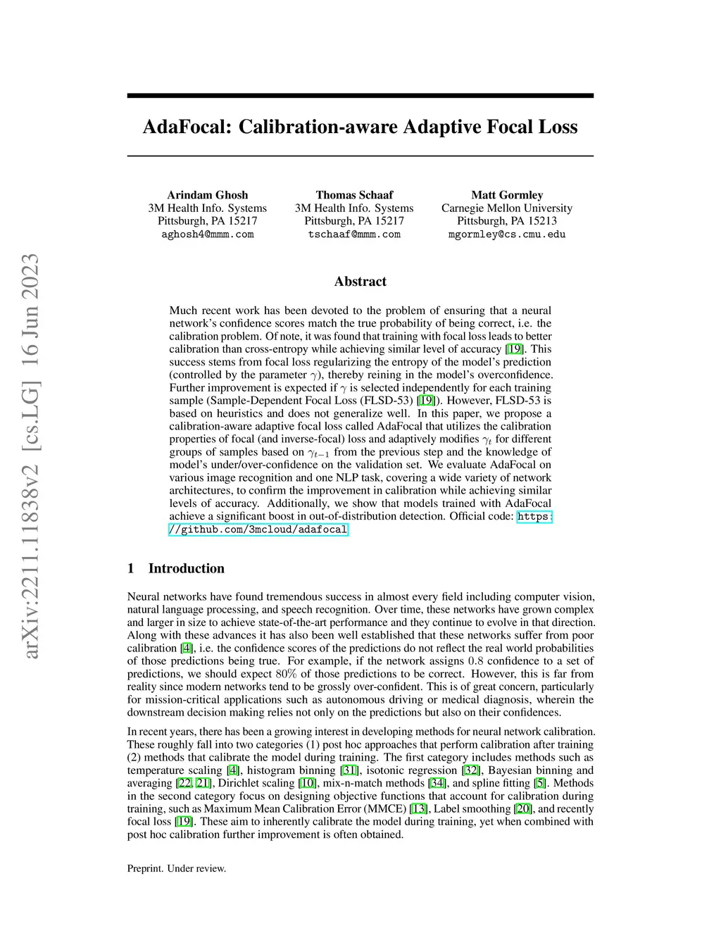 Much recent work has been devoted to the problem of ensuring that a neural network's confidence scores match the true probability of being correct, i.e. the calibration problem. Of note, it was found that training with focal loss leads to better calibration than cross-entropy while achieving similar level of accuracy \cite{mukhoti2020}. This success stems from focal loss regularizing the entropy of the model's prediction (controlled by the parameter ), thereby reining in the model's overconfidence. Further improvement is expected if is selected independently for each training sample (Sample-Dependent Focal Loss (FLSD-53) \cite{mukhoti2020}). However, FLSD-53 is based on heuristics and does not generalize well. In this paper, we propose a calibration-aware adaptive focal loss called AdaFocal that utilizes the calibration properties of focal (and inverse-focal) loss and adaptively modifies for different groups of samples based on from the previous step and the knowledge of model's under/over-confidence on the validation set. We evaluate AdaFocal on various image recognition and one NLP task, covering a wide variety of network architectures, to confirm the improvement in calibration while achieving similar levels of accuracy. Additionally, we show that models trained with AdaFocal achieve a significant boost in out-of-distribution detection.