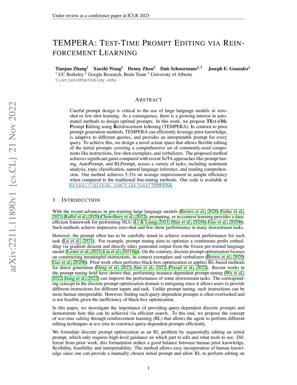 Careful prompt design is critical to the use of large language models in zero-shot or few-shot learning. As a consequence, there is a growing interest in automated methods to design optimal prompts. In this work, we propose Test-time Prompt Editing using Reinforcement learning (TEMPERA). In contrast to prior prompt generation methods, TEMPERA can efficiently leverage prior knowledge, is adaptive to different queries and provides an interpretable prompt for every query. To achieve this, we design a novel action space that allows flexible editing of the initial prompts covering a wide set of commonly-used components like instructions, few-shot exemplars, and verbalizers. The proposed method achieves significant gains compared with recent SoTA approaches like prompt tuning, AutoPrompt, and RLPrompt, across a variety of tasks including sentiment analysis, topic classification, natural language inference, and reading comprehension. Our method achieves 5.33x on average improvement in sample efficiency when compared to the traditional fine-tuning methods.