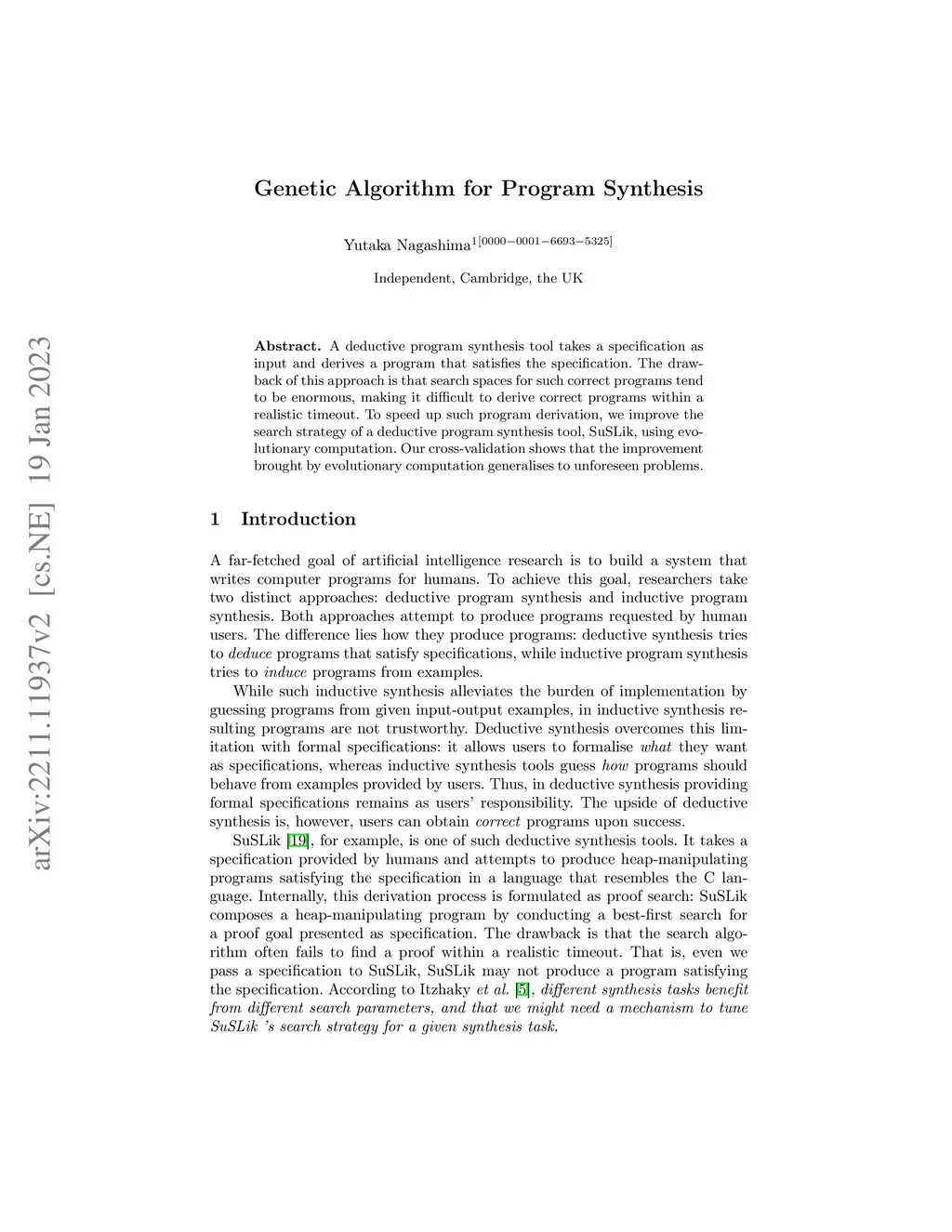 A deductive program synthesis tool takes a specification as input and derives a program that satisfies the specification. The drawback of this approach is that search spaces for such correct programs tend to be enormous, making it difficult to derive correct programs within a realistic timeout. To speed up such program derivation, we improve the search strategy of a deductive program synthesis tool, SuSLik, using evolutionary computation. Our cross-validation shows that the improvement brought by evolutionary computation generalises to unforeseen problems.