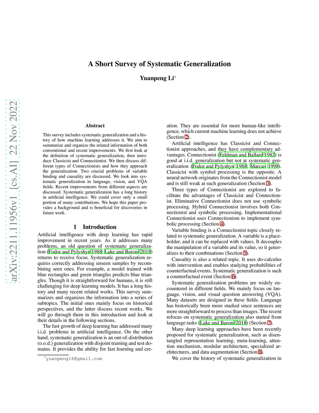 This survey includes systematic generalization and a history of how machine learning addresses it. We aim to summarize and organize the related information of both conventional and recent improvements. We first look at the definition of systematic generalization, then introduce Classicist and Connectionist. We then discuss different types of Connectionists and how they approach the generalization. Two crucial problems of variable binding and causality are discussed. We look into systematic generalization in language, vision, and VQA fields. Recent improvements from different aspects are discussed. Systematic generalization has a long history in artificial intelligence. We could cover only a small portion of many contributions. We hope this paper provides a background and is beneficial for discoveries in future work.