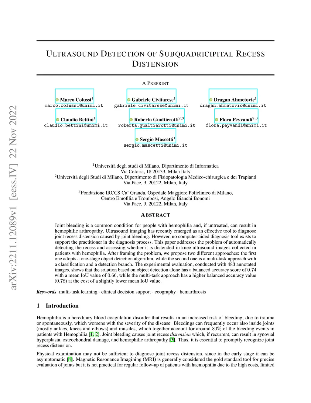 Joint bleeding is a common condition for people with hemophilia and, if untreated, can result in hemophilic arthropathy. Ultrasound imaging has recently emerged as an effective tool to diagnose joint recess distension caused by joint bleeding. However, no computer-aided diagnosis tool exists to support the practitioner in the diagnosis process. This paper addresses the problem of automatically detecting the recess and assessing whether it is distended in knee ultrasound images collected in patients with hemophilia. After framing the problem, we propose two different approaches: the first one adopts a one-stage object detection algorithm, while the second one is a multi-task approach with a classification and a detection branch. The experimental evaluation, conducted with annotated images, shows that the solution based on object detection alone has a balanced accuracy score of with a mean IoU value of , while the multi-task approach has a higher balanced accuracy value () at the cost of a slightly lower mean IoU value.