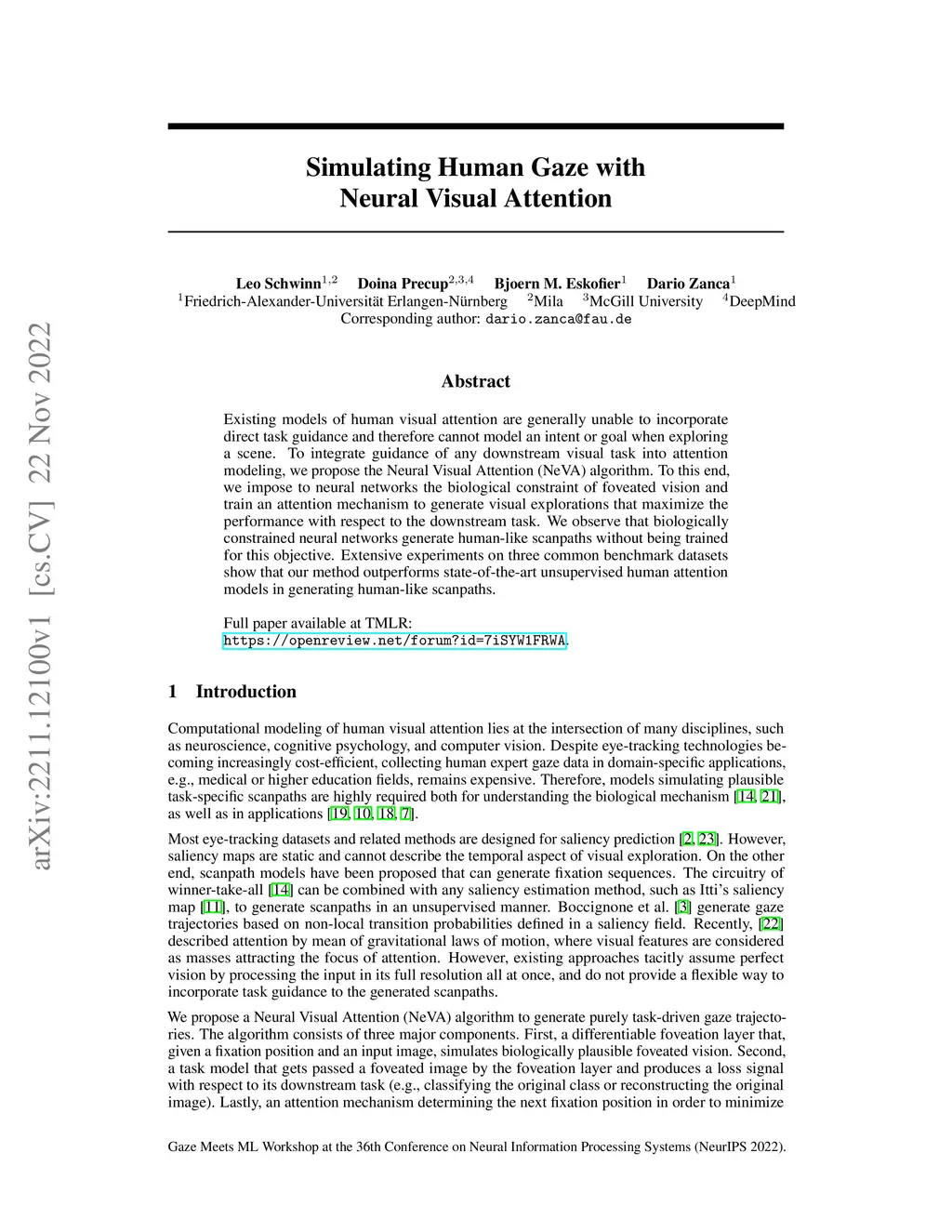 Existing models of human visual attention are generally unable to incorporate direct task guidance and therefore cannot model an intent or goal when exploring a scene. To integrate guidance of any downstream visual task into attention modeling, we propose the Neural Visual Attention (NeVA) algorithm. To this end, we impose to neural networks the biological constraint of foveated vision and train an attention mechanism to generate visual explorations that maximize the performance with respect to the downstream task. We observe that biologically constrained neural networks generate human-like scanpaths without being trained for this objective. Extensive experiments on three common benchmark datasets show that our method outperforms state-of-the-art unsupervised human attention models in generating human-like scanpaths.