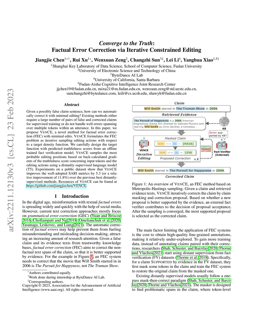 Given a possibly false claim sentence, how can we automatically correct it with minimal editing? Existing methods either require a large number of pairs of false and corrected claims for supervised training or do not handle well errors spanning over multiple tokens within an utterance. In this paper, we propose VENCE, a novel method for factual error correction (FEC) with minimal edits. VENCE formulates the FEC problem as iterative sampling editing actions with respect to a target density function. We carefully design the target function with predicted truthfulness scores from an offline trained fact verification model. VENCE samples the most probable editing positions based on back-calculated gradients of the truthfulness score concerning input tokens and the editing actions using a distantly-supervised language model (T5). Experiments on a public dataset show that VENCE improves the well-adopted SARI metric by 5.3 (or a relative improvement of 11.8%) over the previous best distantly-supervised methods.