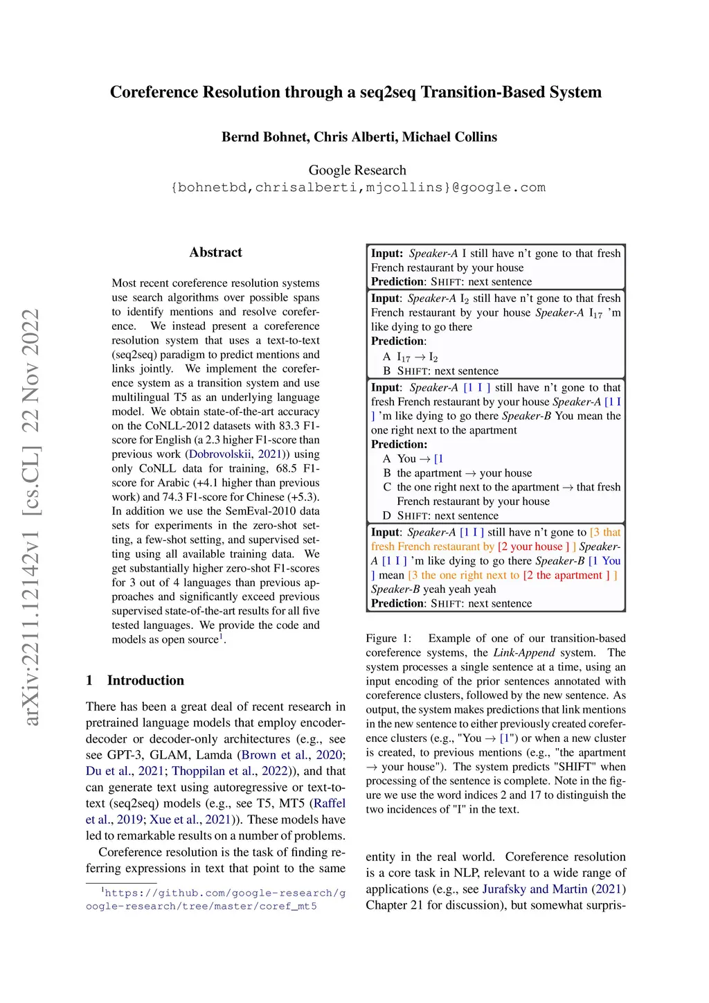 Most recent coreference resolution systems use search algorithms over possible spans to identify mentions and resolve coreference. We instead present a coreference resolution system that uses a text-to-text (seq2seq) paradigm to predict mentions and links jointly. We implement the coreference system as a transition system and use multilingual T5 as an underlying language model. We obtain state-of-the-art accuracy on the CoNLL-2012 datasets with 83.3 F1-score for English (a 2.3 higher F1-score than previous work (Dobrovolskii, 2021)) using only CoNLL data for training, 68.5 F1-score for Arabic (+4.1 higher than previous work) and 74.3 F1-score for Chinese (+5.3). In addition we use the SemEval-2010 data sets for experiments in the zero-shot setting, a few-shot setting, and supervised setting using all available training data. We get substantially higher zero-shot F1-scores for 3 out of 4 languages than previous approaches and significantly exceed previous supervised state-of-the-art results for all five tested languages.