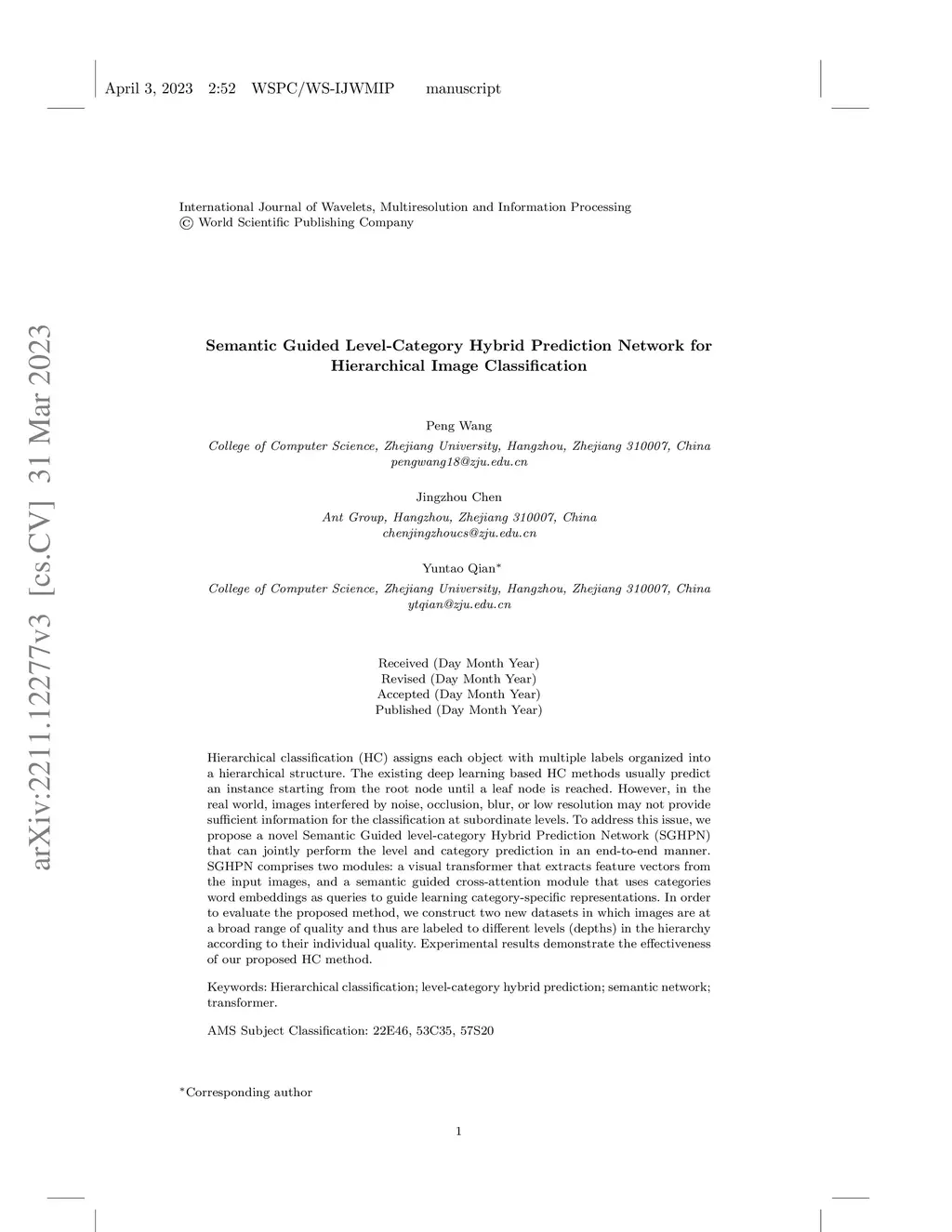 Hierarchical classification (HC) assigns each object with multiple labels organized into a hierarchical structure. The existing deep learning based HC methods usually predict an instance starting from the root node until a leaf node is reached. However, in the real world, images interfered by noise, occlusion, blur, or low resolution may not provide sufficient information for the classification at subordinate levels. To address this issue, we propose a novel semantic guided level-category hybrid prediction network (SGLCHPN) that can jointly perform the level and category prediction in an end-to-end manner. SGLCHPN comprises two modules: a visual transformer that extracts feature vectors from the input images, and a semantic guided cross-attention module that uses categories word embeddings as queries to guide learning category-specific representations. In order to evaluate the proposed method, we construct two new datasets in which images are at a broad range of quality and thus are labeled to different levels (depths) in the hierarchy according to their individual quality. Experimental results demonstrate the effectiveness of our proposed HC method.
