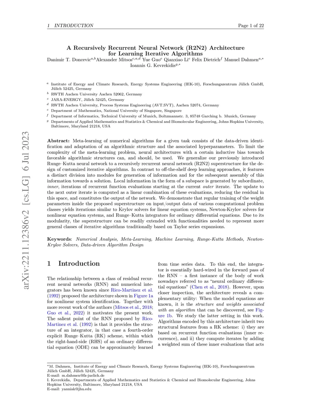 Meta-learning of numerical algorithms for a given task consists of the data-driven identification and adaptation of an algorithmic structure and the associated hyperparameters. To limit the complexity of the meta-learning problem, neural architectures with a certain inductive bias towards favorable algorithmic structures can, and should, be used. We generalize our previously introduced Runge-Kutta neural network to a recursively recurrent neural network (R2N2) superstructure for the design of customized iterative algorithms. In contrast to off-the-shelf deep learning approaches, it features a distinct division into modules for generation of information and for the subsequent assembly of this information towards a solution. Local information in the form of a subspace is generated by subordinate, inner, iterations of recurrent function evaluations starting at the current outer iterate. The update to the next outer iterate is computed as a linear combination of these evaluations, reducing the residual in this space, and constitutes the output of the network. We demonstrate that regular training of the weight parameters inside the proposed superstructure on input/output data of various computational problem classes yields iterations similar to Krylov solvers for linear equation systems, Newton-Krylov solvers for nonlinear equation systems, and Runge-Kutta integrators for ordinary differential equations. Due to its modularity, the superstructure can be readily extended with functionalities needed to represent more general classes of iterative algorithms traditionally based on Taylor series expansions.