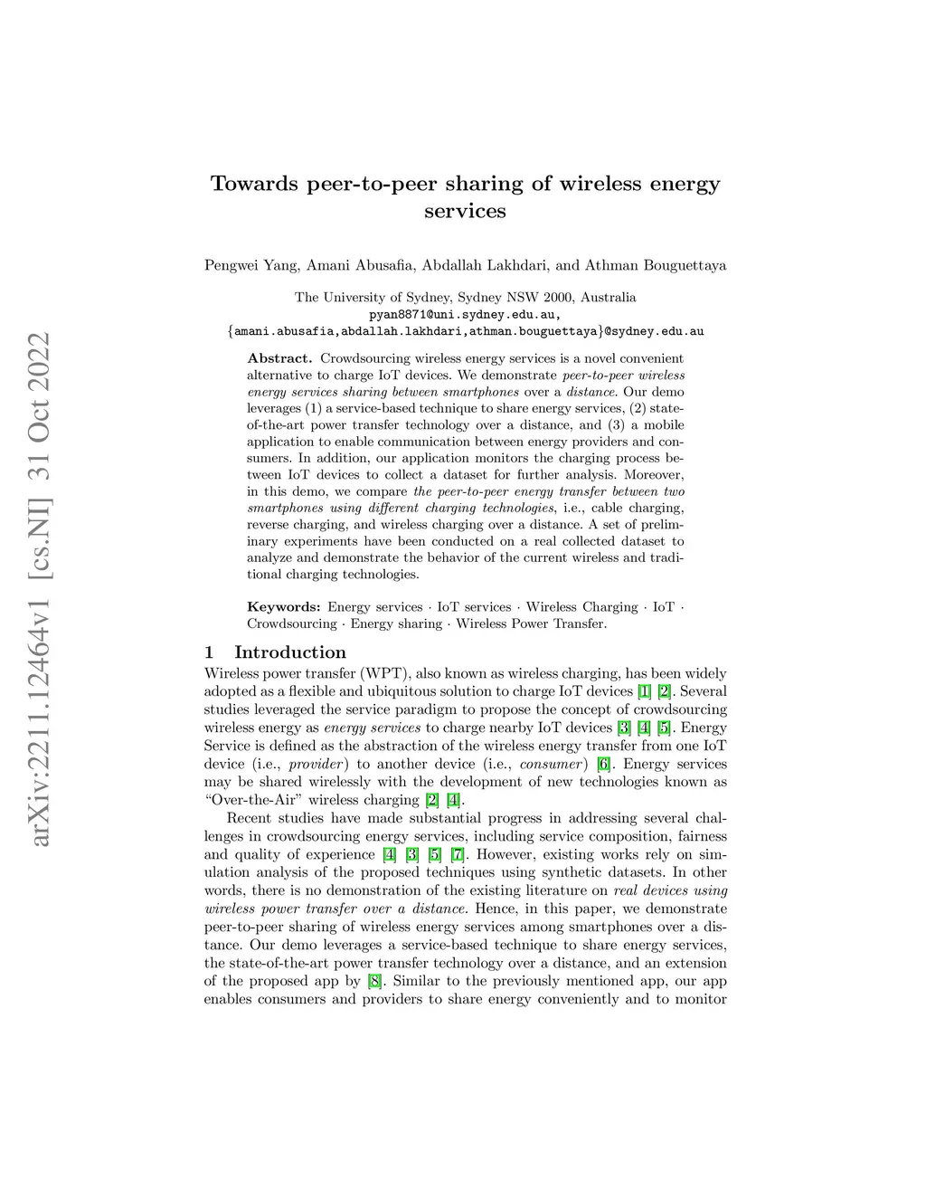 Crowdsourcing wireless energy services is a novel convenient alternative to charge IoT devices. We demonstrate peer-to-peer wireless energy services sharing between smartphones over a distance. Our demo leverages (1) a service-based technique to share energy services, (2) state-of-the-art power transfer technology over a distance, and (3) a mobile application to enable communication between energy providers and consumers. In addition, our application monitors the charging process between IoT devices to collect a dataset for further analysis. Moreover, in this demo, we compare the peer-to-peer energy transfer between two smartphones using different charging technologies, i.e., cable charging, reveres charging, and wireless charging over a distance. A set of preliminary experiments has been conducted on a real collected dataset to analyze and demonstrate the behavior of the current wireless and traditional charging technologies.