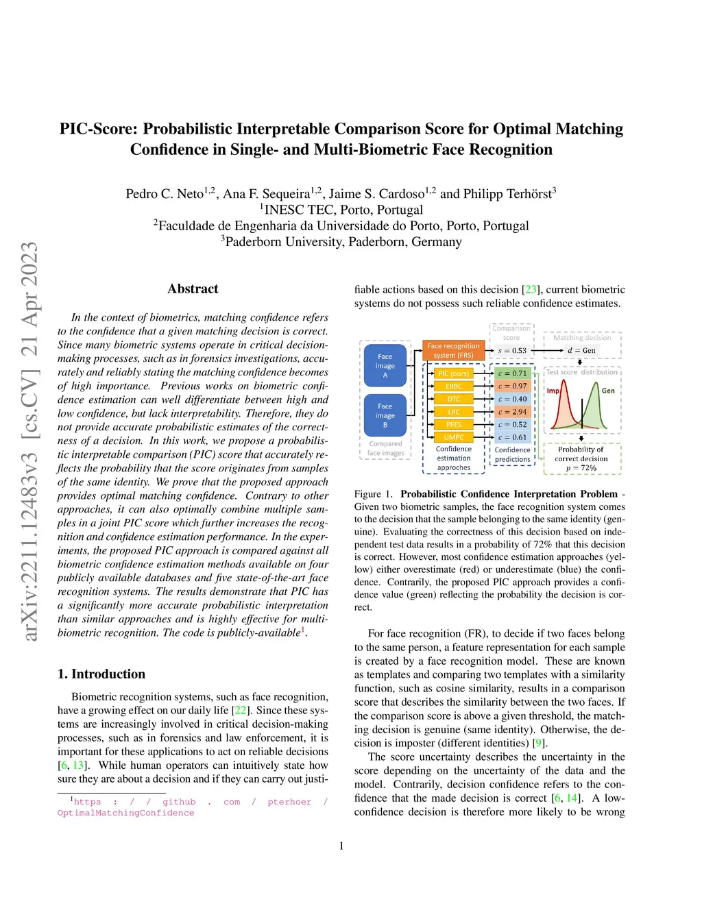 PIC-Score: Probabilistic Interpretable Comparison Score for Optimal Matching Confidence in Single- and Multi-Biometric (Face) Recognition