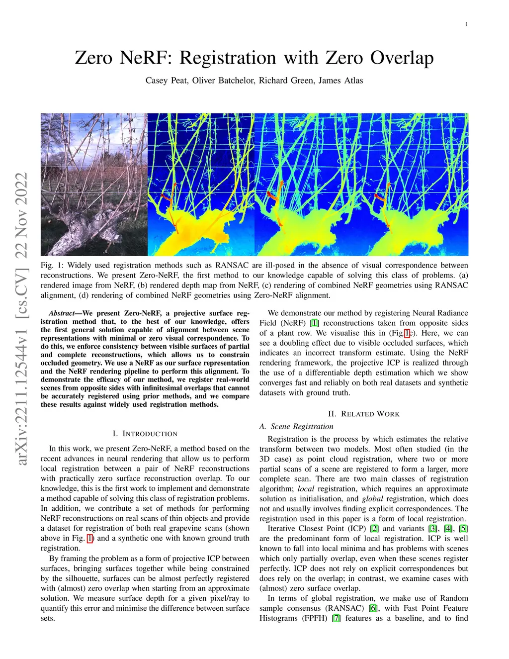 We present Zero-NeRF, a projective surface registration method that, to the best of our knowledge, offers the first general solution capable of alignment between scene representations with minimal or zero visual correspondence. To do this, we enforce consistency between visible surfaces of partial and complete reconstructions, which allows us to constrain occluded geometry. We use a NeRF as our surface representation and the NeRF rendering pipeline to perform this alignment. To demonstrate the efficacy of our method, we register real-world scenes from opposite sides with infinitesimal overlaps that cannot be accurately registered using prior methods, and we compare these results against widely used registration methods.