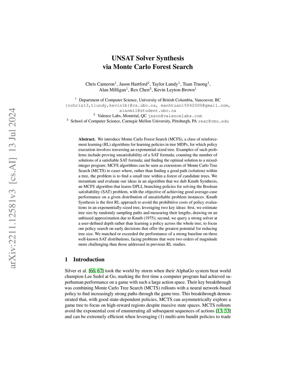 We introduce Monte Carlo Forest Search (MCFS), a class of reinforcement learning (RL) algorithms for learning policies in {tree MDPs}, for which policy execution involves traversing an exponential-sized tree. Examples of such problems include proving unsatisfiability of a SAT formula; counting the number of solutions of a satisfiable SAT formula; and finding the optimal solution to a mixed-integer program. MCFS algorithms can be seen as extensions of Monte Carlo Tree Search (MCTS) to cases where, rather than finding a good path (solution) within a tree, the problem is to find a small tree within a forest of candidate trees. We instantiate and evaluate our ideas in an algorithm that we dub Knuth Synthesis, an MCFS algorithm that learns DPLL branching policies for solving the Boolean satisfiability (SAT) problem, with the objective of achieving good average-case performance on a given distribution of unsatisfiable problem instances. Knuth Synthesis is the first RL approach to avoid the prohibitive costs of policy evaluations in an exponentially-sized tree, leveraging two key ideas: first, we estimate tree size by randomly sampling paths and measuring their lengths, drawing on an unbiased approximation due to Knuth (1975); second, we query a strong solver at a user-defined depth rather than learning a policy across the whole tree, to focus our policy search on early decisions that offer the greatest potential for reducing tree size. We matched or exceeded the performance of a strong baseline on three well-known SAT distributions, facing problems that were two orders of magnitude more challenging than those addressed in previous RL studies.