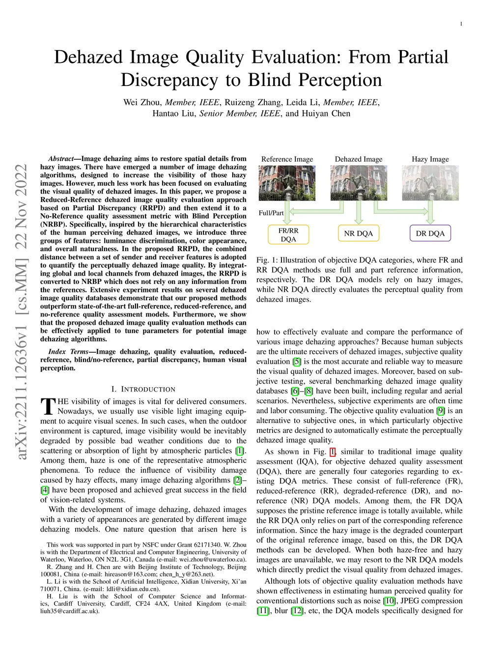 Image dehazing aims to restore spatial details from hazy images. There have emerged a number of image dehazing algorithms, designed to increase the visibility of those hazy images. However, much less work has been focused on evaluating the visual quality of dehazed images. In this paper, we propose a Reduced-Reference dehazed image quality evaluation approach based on Partial Discrepancy (RRPD) and then extend it to a No-Reference quality assessment metric with Blind Perception (NRBP). Specifically, inspired by the hierarchical characteristics of the human perceiving dehazed images, we introduce three groups of features: luminance discrimination, color appearance, and overall naturalness. In the proposed RRPD, the combined distance between a set of sender and receiver features is adopted to quantify the perceptually dehazed image quality. By integrating global and local channels from dehazed images, the RRPD is converted to NRBP which does not rely on any information from the references. Extensive experiment results on several dehazed image quality databases demonstrate that our proposed methods outperform state-of-the-art full-reference, reduced-reference, and no-reference quality assessment models. Furthermore, we show that the proposed dehazed image quality evaluation methods can be effectively applied to tune parameters for potential image dehazing algorithms.