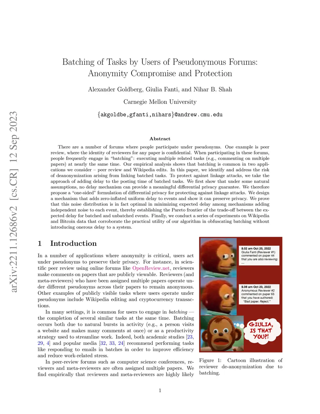 There are a number of forums where people participate under pseudonyms. One example is peer review, where the identity of reviewers for any paper is confidential. When participating in these forums, people frequently engage in "batching": executing multiple related tasks (e.g., commenting on multiple papers) at nearly the same time. Our empirical analysis shows that batching is common in two applications we consider peer review and Wikipedia edits. In this paper, we identify and address the risk of deanonymization arising from linking batched tasks. To protect against linkage attacks, we take the approach of adding delay to the posting time of batched tasks. We first show that under some natural assumptions, no delay mechanism can provide a meaningful differential privacy guarantee. We therefore propose a "one-sided" formulation of differential privacy for protecting against linkage attacks. We design a mechanism that adds zero-inflated uniform delay to events and show it can preserve privacy. We prove that this noise distribution is in fact optimal in minimizing expected delay among mechanisms adding independent noise to each event, thereby establishing the Pareto frontier of the trade-off between the expected delay for batched and unbatched events. Finally, we conduct a series of experiments on Wikipedia and Bitcoin data that corroborate the practical utility of our algorithm in obfuscating batching without introducing onerous delay to a system.
