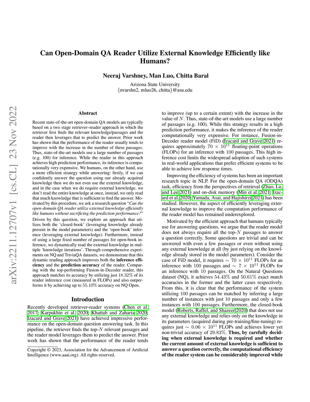Recent state-of-the-art open-domain QA models are typically based on a two stage retriever-reader approach in which the retriever first finds the relevant knowledge/passages and the reader then leverages that to predict the answer. Prior work has shown that the performance of the reader usually tends to improve with the increase in the number of these passages. Thus, state-of-the-art models use a large number of passages (e.g. 100) for inference. While the reader in this approach achieves high prediction performance, its inference is computationally very expensive. We humans, on the other hand, use a more efficient strategy while answering: firstly, if we can confidently answer the question using our already acquired knowledge then we do not even use the external knowledge, and in the case when we do require external knowledge, we don't read the entire knowledge at once, instead, we only read that much knowledge that is sufficient to find the answer. Motivated by this procedure, we ask a research question "Can the open-domain QA reader utilize external knowledge efficiently like humans without sacrificing the prediction performance?" Driven by this question, we explore an approach that utilizes both 'closed-book' (leveraging knowledge already present in the model parameters) and ópen-book' inference (leveraging external knowledge). Furthermore, instead of using a large fixed number of passages for open-book inference, we dynamically read the external knowledge in multiple 'knowledge iterations'. Through comprehensive experiments on NQ and TriviaQA datasets, we demonstrate that this dynamic reading approach improves both the ínference efficiency' and the 'prediction accuracy' of the reader. Comparing with the FiD reader, this approach matches its accuracy by utilizing just 18.32% of its reader inference cost and also outperforms it by achieving up to 55.10% accuracy on NQ Open.