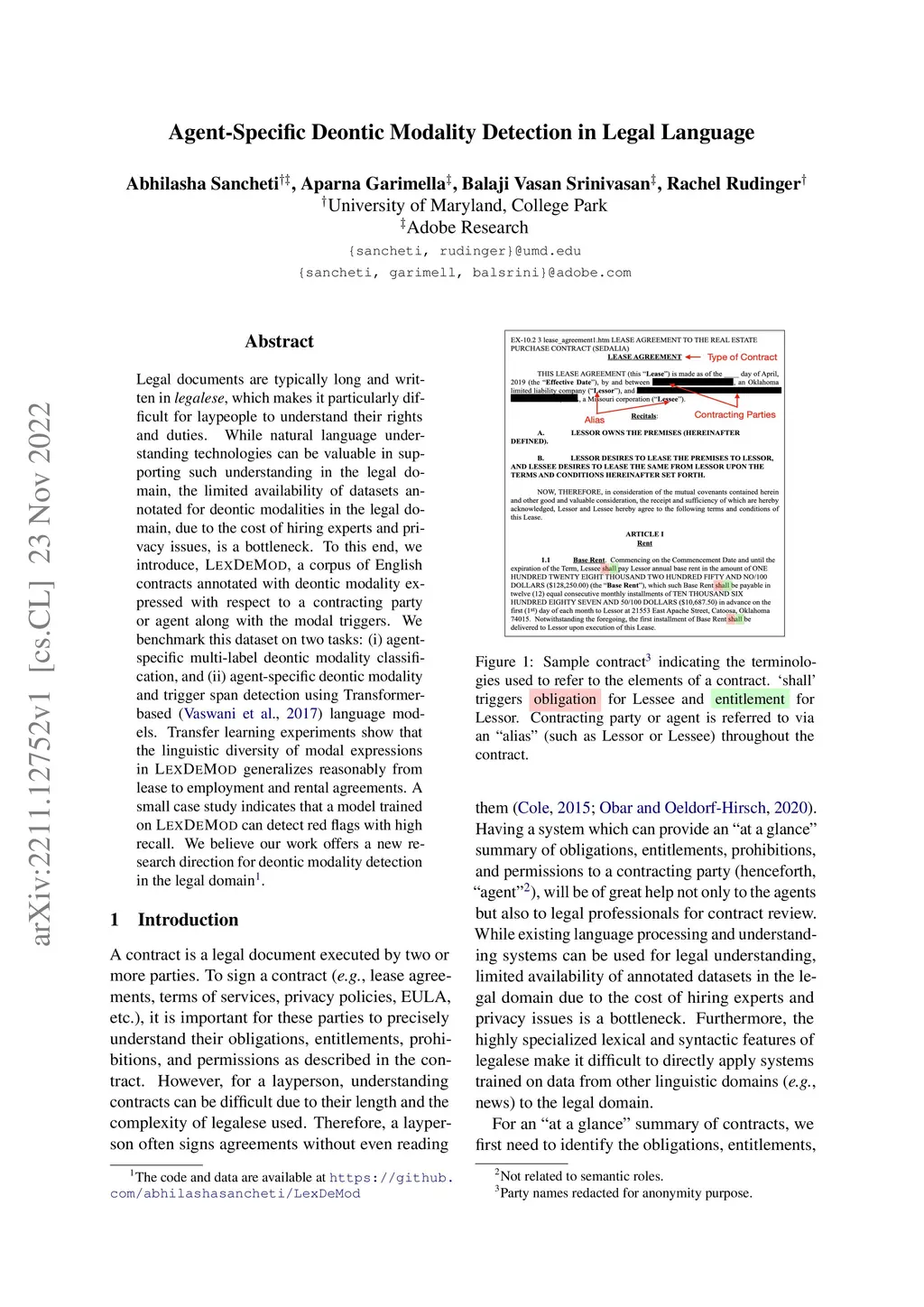 Legal documents are typically long and written in legalese, which makes it particularly difficult for laypeople to understand their rights and duties. While natural language understanding technologies can be valuable in supporting such understanding in the legal domain, the limited availability of datasets annotated for deontic modalities in the legal domain, due to the cost of hiring experts and privacy issues, is a bottleneck. To this end, we introduce, LEXDEMOD, a corpus of English contracts annotated with deontic modality expressed with respect to a contracting party or agent along with the modal triggers. We benchmark this dataset on two tasks: (i) agent-specific multi-label deontic modality classification, and (ii) agent-specific deontic modality and trigger span detection using Transformer-based (Vaswani et al., 2017) language models. Transfer learning experiments show that the linguistic diversity of modal expressions in LEXDEMOD generalizes reasonably from lease to employment and rental agreements. A small case study indicates that a model trained on LEXDEMOD can detect red flags with high recall. We believe our work offers a new research direction for deontic modality detection in the legal domain.