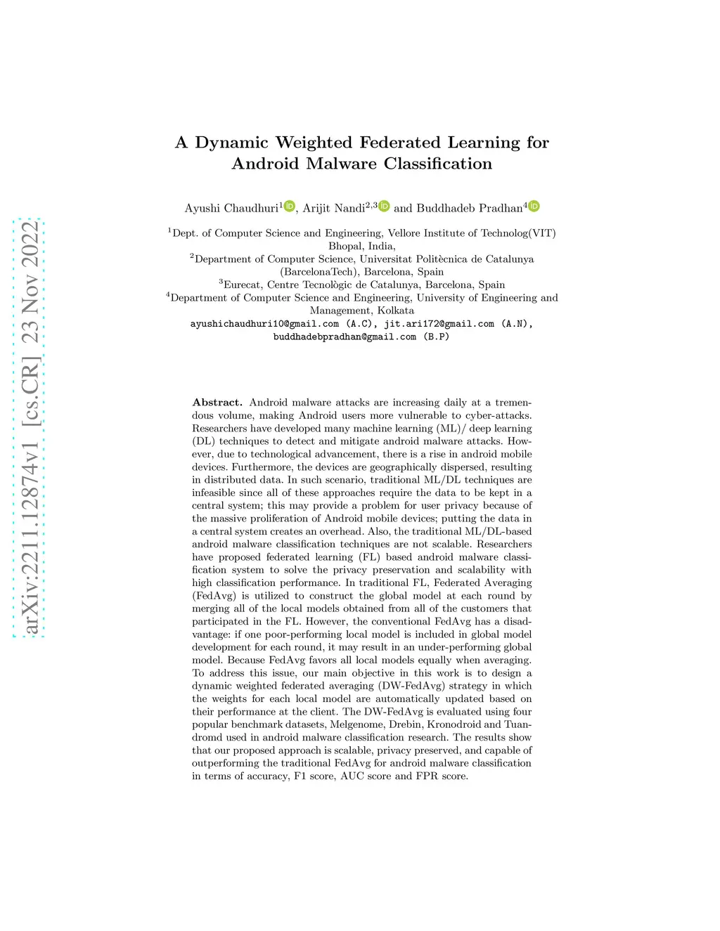 A Dynamic Weighted Federated Learning for Android Malware Classification