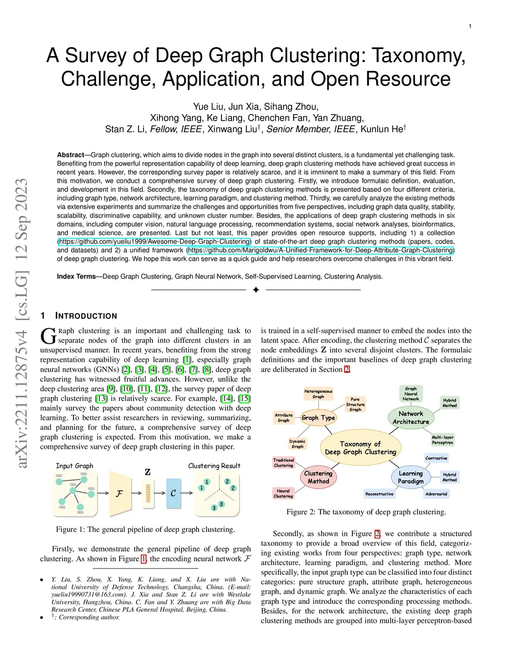 Graph clustering, which aims to divide nodes in the graph into several distinct clusters, is a fundamental yet challenging task. Benefiting from the powerful representation capability of deep learning, deep graph clustering methods have achieved great success in recent years. However, the corresponding survey paper is relatively scarce, and it is imminent to make a summary of this field. From this motivation, we conduct a comprehensive survey of deep graph clustering. Firstly, we introduce formulaic definition, evaluation, and development in this field. Secondly, the taxonomy of deep graph clustering methods is presented based on four different criteria, including graph type, network architecture, learning paradigm, and clustering method. Thirdly, we carefully analyze the existing methods via extensive experiments and summarize the challenges and opportunities from five perspectives, including graph data quality, stability, scalability, discriminative capability, and unknown cluster number. Besides, the applications of deep graph clustering methods in six domains, including computer vision, natural language processing, recommendation systems, social network analyses, bioinformatics, and medical science, are presented. Last but not least, this paper provides open resource supports, including 1) a collection (\url{https://github.com/yueliu1999/Awesome-Deep-Graph-Clustering}) of state-of-the-art deep graph clustering methods (papers, codes, and datasets) and 2) a unified framework (\url{https://github.com/Marigoldwu/A-Unified-Framework-for-Deep-Attribute-Graph-Clustering}) of deep graph clustering. We hope this work can serve as a quick guide and help researchers overcome challenges in this vibrant field.