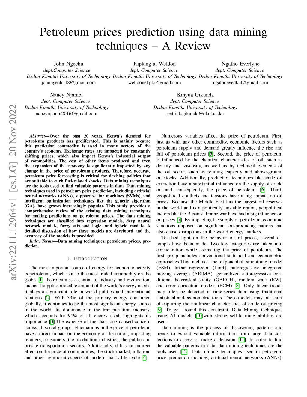 Over the past 20 years, Kenya's demand for petroleum products has proliferated. This is mainly because this particular commodity is used in many sectors of the country's economy. Exchange rates are impacted by constantly shifting prices, which also impact Kenya's industrial output of commodities. The cost of other items produced and even the expansion of the economy is significantly impacted by any change in the price of petroleum products. Therefore, accurate petroleum price forecasting is critical for devising policies that are suitable to curb fuel-related shocks. Data mining techniques are the tools used to find valuable patterns in data. Data mining techniques used in petroleum price prediction, including artificial neural networks (ANNs), support vector machines (SVMs), and intelligent optimization techniques like the genetic algorithm (GA), have grown increasingly popular. This study provides a comprehensive review of the existing data mining techniques for making predictions on petroleum prices. The data mining techniques are classified into regression models, deep neural network models, fuzzy sets and logic, and hybrid models. A detailed discussion of how these models are developed and the accuracy of the models is provided.