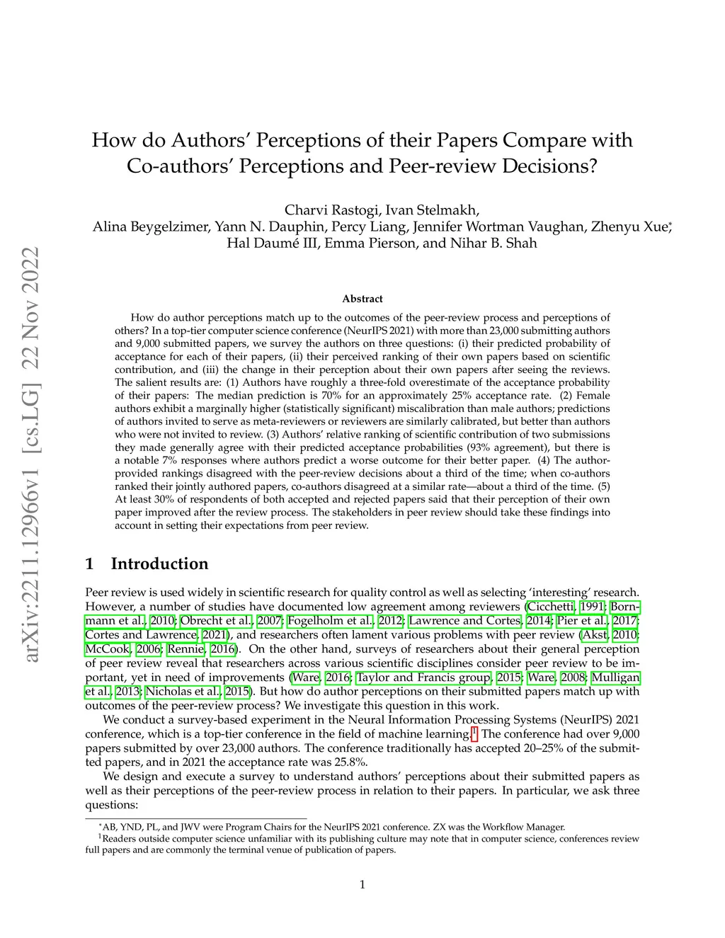 How do author perceptions match up to the outcomes of the peer-review process and perceptions of others? In a top-tier computer science conference (NeurIPS 2021) with more than 23,000 submitting authors and 9,000 submitted papers, we survey the authors on three questions: (i) their predicted probability of acceptance for each of their papers, (ii) their perceived ranking of their own papers based on scientific contribution, and (iii) the change in their perception about their own papers after seeing the reviews. The salient results are: (1) Authors have roughly a three-fold overestimate of the acceptance probability of their papers: The median prediction is 70% for an approximately 25% acceptance rate. (2) Female authors exhibit a marginally higher (statistically significant) miscalibration than male authors; predictions of authors invited to serve as meta-reviewers or reviewers are similarly calibrated, but better than authors who were not invited to review. (3) Authors' relative ranking of scientific contribution of two submissions they made generally agree (93%) with their predicted acceptance probabilities, but there is a notable 7% responses where authors think their better paper will face a worse outcome. (4) The author-provided rankings disagreed with the peer-review decisions about a third of the time; when co-authors ranked their jointly authored papers, co-authors disagreed at a similar rate -- about a third of the time. (5) At least 30% of respondents of both accepted and rejected papers said that their perception of their own paper improved after the review process. The stakeholders in peer review should take these findings into account in setting their expectations from peer review.