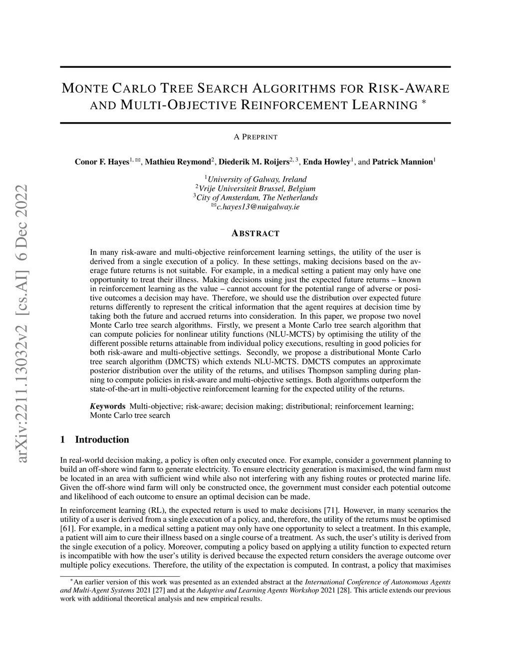 In many risk-aware and multi-objective reinforcement learning settings, the utility of the user is derived from a single execution of a policy. In these settings, making decisions based on the average future returns is not suitable. For example, in a medical setting a patient may only have one opportunity to treat their illness. Making decisions using just the expected future returns -- known in reinforcement learning as the value -- cannot account for the potential range of adverse or positive outcomes a decision may have. Therefore, we should use the distribution over expected future returns differently to represent the critical information that the agent requires at decision time by taking both the future and accrued returns into consideration. In this paper, we propose two novel Monte Carlo tree search algorithms. Firstly, we present a Monte Carlo tree search algorithm that can compute policies for nonlinear utility functions (NLU-MCTS) by optimising the utility of the different possible returns attainable from individual policy executions, resulting in good policies for both risk-aware and multi-objective settings. Secondly, we propose a distributional Monte Carlo tree search algorithm (DMCTS) which extends NLU-MCTS. DMCTS computes an approximate posterior distribution over the utility of the returns, and utilises Thompson sampling during planning to compute policies in risk-aware and multi-objective settings. Both algorithms outperform the state-of-the-art in multi-objective reinforcement learning for the expected utility of the returns.