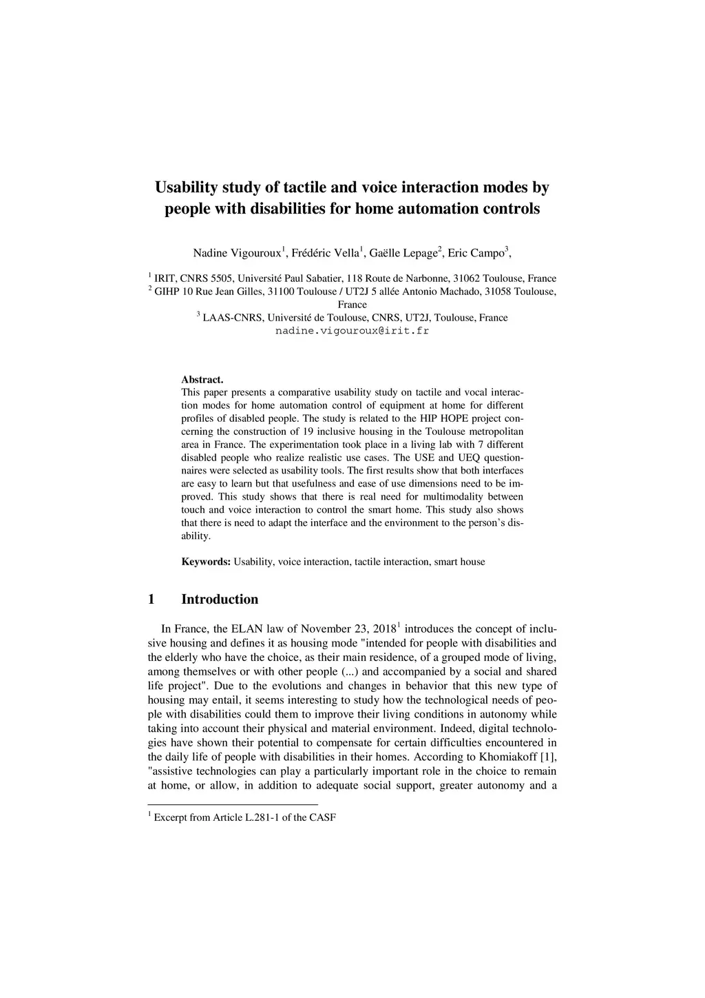 This paper presents a comparative usability study on tactile and vocal interaction modes for home automation control of equipment at home for different profiles of disabled people. The study is related to the HIP HOPE project concerning the construction of 19 inclusive housing in the Toulouse metropolitan area in France. The experimentation took place in a living lab with 7 different disabled people who realize realistic use cases. The USE and UEQ questionnaires were selected as usability tools. The first results show that both interfaces are easy to learn but that usefulness and ease of use dimensions need to be improved. This study shows that there is real need for multimodality between touch and voice interaction to control the smart home. This study also shows that there is need to adapt the interface and the environment to the person's disability.