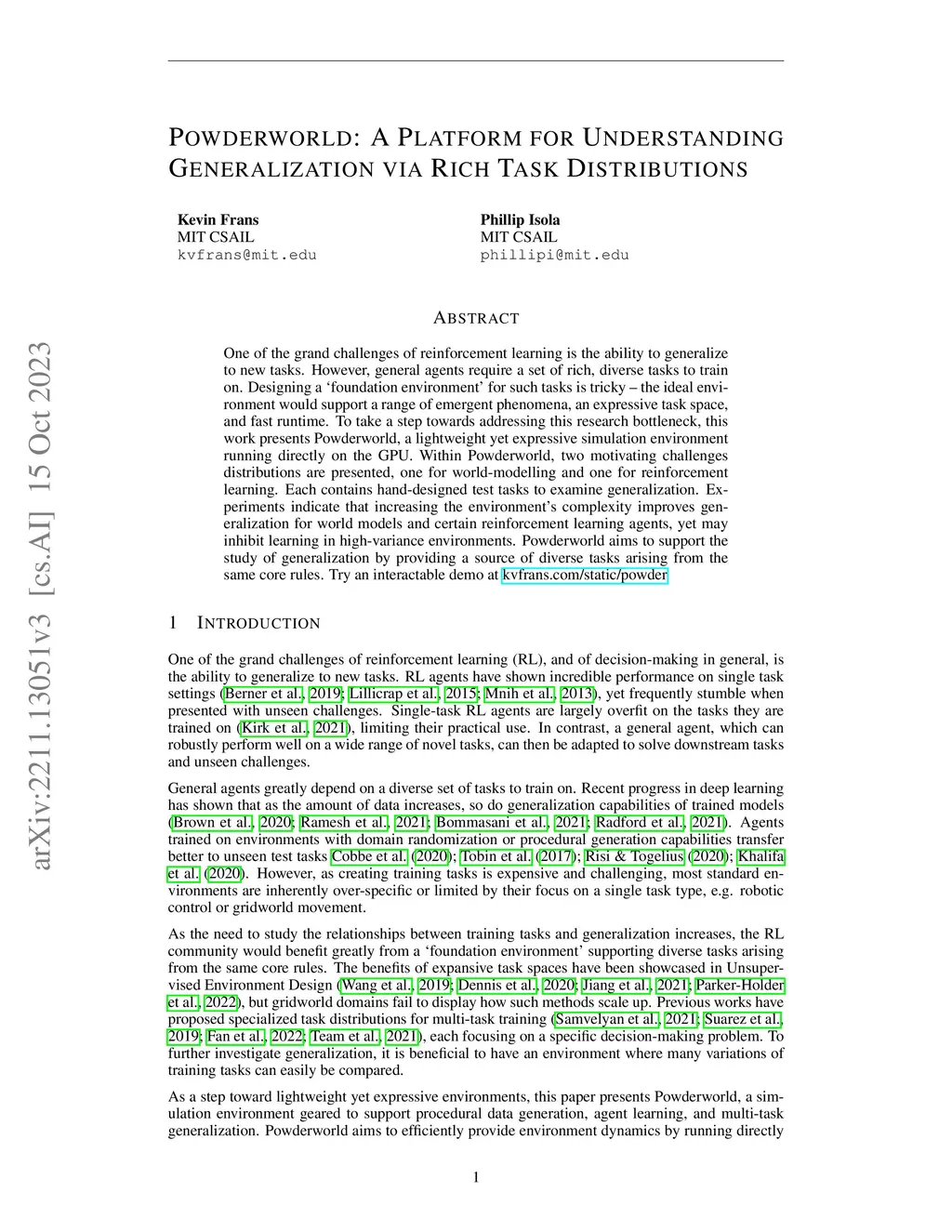 One of the grand challenges of reinforcement learning is the ability to generalize to new tasks. However, general agents require a set of rich, diverse tasks to train on. Designing a `foundation environment' for such tasks is tricky -- the ideal environment would support a range of emergent phenomena, an expressive task space, and fast runtime. To take a step towards addressing this research bottleneck, this work presents Powderworld, a lightweight yet expressive simulation environment running directly on the GPU. Within Powderworld, two motivating challenges distributions are presented, one for world-modelling and one for reinforcement learning. Each contains hand-designed test tasks to examine generalization. Experiments indicate that increasing the environment's complexity improves generalization for world models and certain reinforcement learning agents, yet may inhibit learning in high-variance environments. Powderworld aims to support the study of generalization by providing a source of diverse tasks arising from the same core rules.