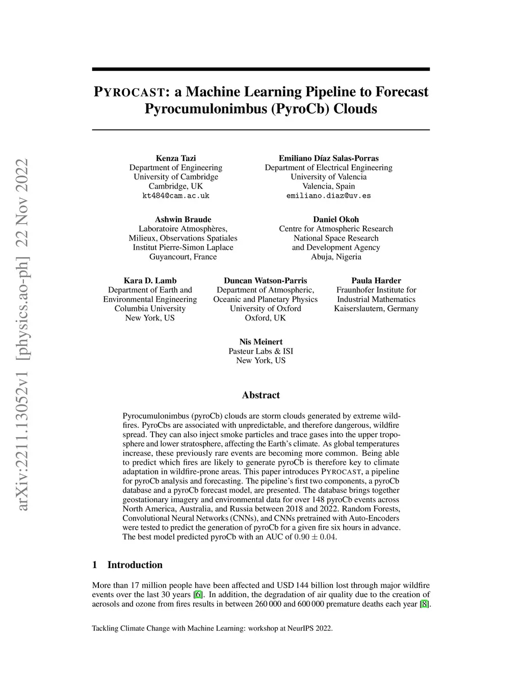 Pyrocumulonimbus (pyroCb) clouds are storm clouds generated by extreme wildfires. PyroCbs are associated with unpredictable, and therefore dangerous, wildfire spread. They can also inject smoke particles and trace gases into the upper troposphere and lower stratosphere, affecting the Earth's climate. As global temperatures increase, these previously rare events are becoming more common. Being able to predict which fires are likely to generate pyroCb is therefore key to climate adaptation in wildfire-prone areas. This paper introduces Pyrocast, a pipeline for pyroCb analysis and forecasting. The pipeline's first two components, a pyroCb database and a pyroCb forecast model, are presented. The database brings together geostationary imagery and environmental data for over 148 pyroCb events across North America, Australia, and Russia between 2018 and 2022. Random Forests, Convolutional Neural Networks (CNNs), and CNNs pretrained with Auto-Encoders were tested to predict the generation of pyroCb for a given fire six hours in advance. The best model predicted pyroCb with an AUC of .