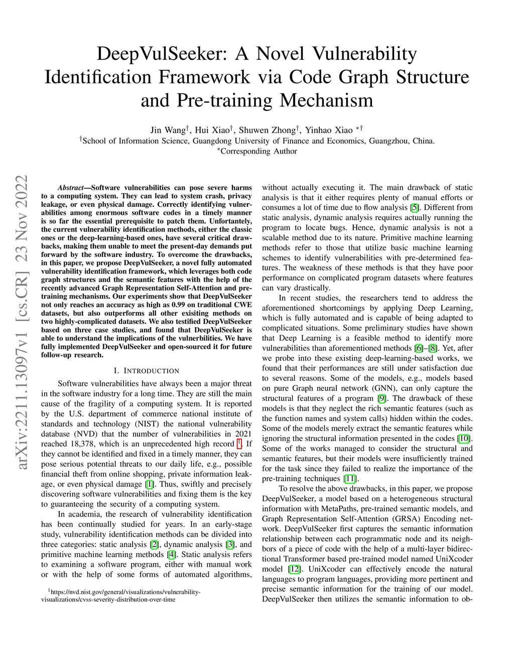 Software vulnerabilities can pose severe harms to a computing system. They can lead to system crash, privacy leakage, or even physical damage. Correctly identifying vulnerabilities among enormous software codes in a timely manner is so far the essential prerequisite to patch them. Unfortantely, the current vulnerability identification methods, either the classic ones or the deep-learning-based ones, have several critical drawbacks, making them unable to meet the present-day demands put forward by the software industry. To overcome the drawbacks, in this paper, we propose DeepVulSeeker, a novel fully automated vulnerability identification framework, which leverages both code graph structures and the semantic features with the help of the recently advanced Graph Representation Self-Attention and pre-training mechanisms. Our experiments show that DeepVulSeeker not only reaches an accuracy as high as 0.99 on traditional CWE datasets, but also outperforms all other exisiting methods on two highly-complicated datasets. We also testified DeepVulSeeker based on three case studies, and found that DeepVulSeeker is able to understand the implications of the vulnerbilities. We have fully implemented DeepVulSeeker and open-sourced it for future follow-up research.