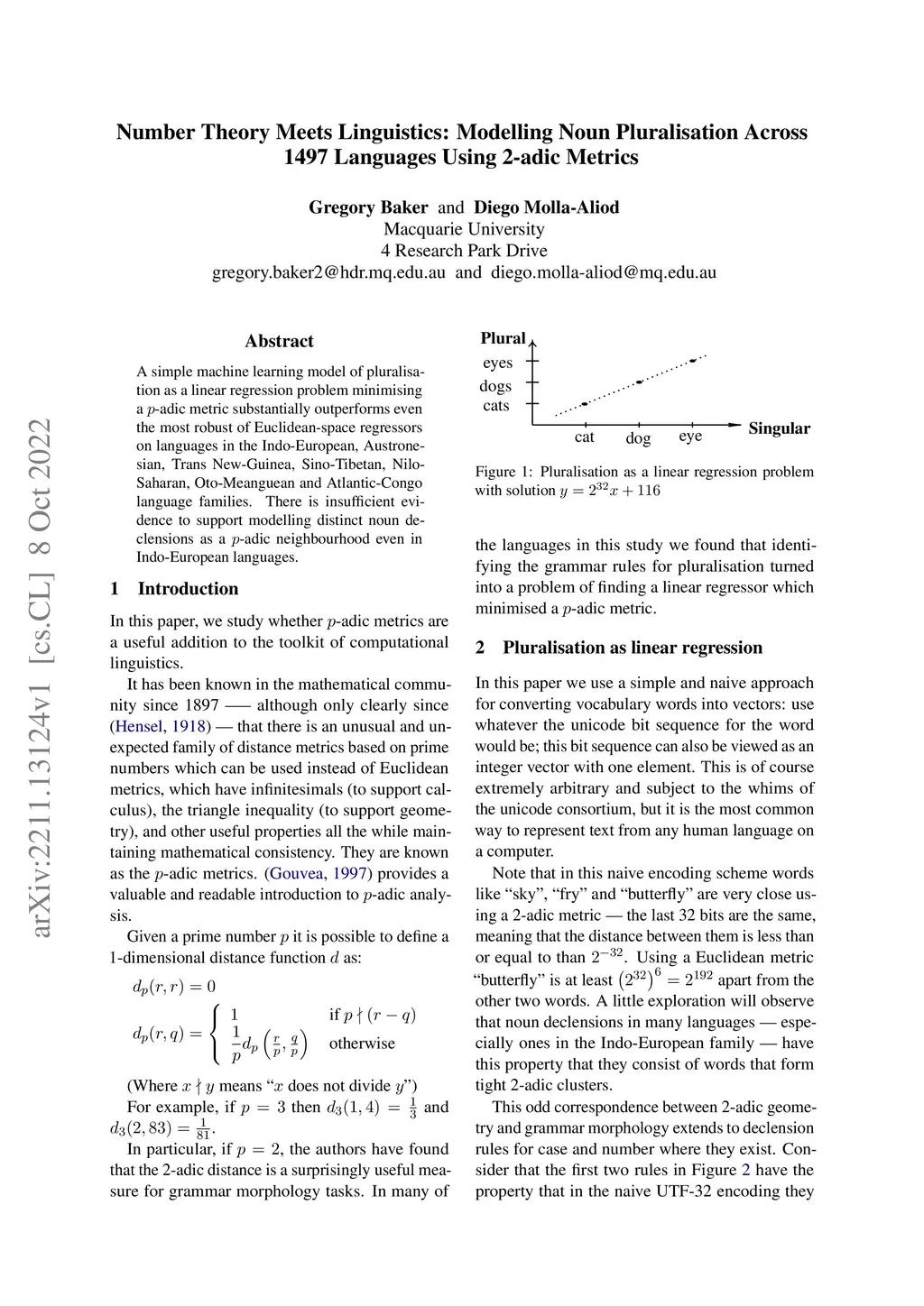 A simple machine learning model of pluralisation as a linear regression problem minimising a p-adic metric substantially outperforms even the most robust of Euclidean-space regressors on languages in the Indo-European, Austronesian, Trans New-Guinea, Sino-Tibetan, Nilo-Saharan, Oto-Meanguean and Atlantic-Congo language families. There is insufficient evidence to support modelling distinct noun declensions as a p-adic neighbourhood even in Indo-European languages.