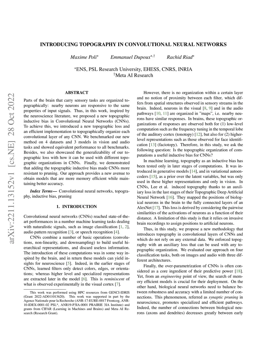 Parts of the brain that carry sensory tasks are organized topographically: nearby neurons are responsive to the same properties of input signals. Thus, in this work, inspired by the neuroscience literature, we proposed a new topographic inductive bias in Convolutional Neural Networks (CNNs). To achieve this, we introduced a new topographic loss and an efficient implementation to topographically organize each convolutional layer of any CNN. We benchmarked our new method on 4 datasets and 3 models in vision and audio tasks and showed equivalent performance to all benchmarks. Besides, we also showcased the generalizability of our topographic loss with how it can be used with different topographic organizations in CNNs. Finally, we demonstrated that adding the topographic inductive bias made CNNs more resistant to pruning. Our approach provides a new avenue to obtain models that are more memory efficient while maintaining better accuracy.
