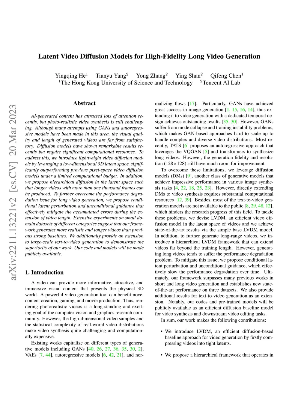 AI-generated content has attracted lots of attention recently, but photo-realistic video synthesis is still challenging. Although many attempts using GANs and autoregressive models have been made in this area, the visual quality and length of generated videos are far from satisfactory. Diffusion models have shown remarkable results recently but require significant computational resources. To address this, we introduce lightweight video diffusion models by leveraging a low-dimensional 3D latent space, significantly outperforming previous pixel-space video diffusion models under a limited computational budget. In addition, we propose hierarchical diffusion in the latent space such that longer videos with more than one thousand frames can be produced. To further overcome the performance degradation issue for long video generation, we propose conditional latent perturbation and unconditional guidance that effectively mitigate the accumulated errors during the extension of video length. Extensive experiments on small domain datasets of different categories suggest that our framework generates more realistic and longer videos than previous strong baselines. We additionally provide an extension to large-scale text-to-video generation to demonstrate the superiority of our work. Our code and models will be made publicly available.