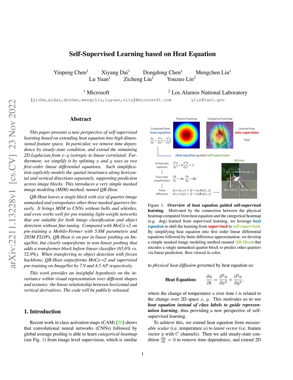 This paper presents a new perspective of self-supervised learning based on extending heat equation into high dimensional feature space. In particular, we remove time dependence by steady-state condition, and extend the remaining 2D Laplacian from x--y isotropic to linear correlated. Furthermore, we simplify it by splitting x and y axes as two first-order linear differential equations. Such simplification explicitly models the spatial invariance along horizontal and vertical directions separately, supporting prediction across image blocks. This introduces a very simple masked image modeling (MIM) method, named QB-Heat. QB-Heat leaves a single block with size of quarter image unmasked and extrapolates other three masked quarters linearly. It brings MIM to CNNs without bells and whistles, and even works well for pre-training light-weight networks that are suitable for both image classification and object detection without fine-tuning. Compared with MoCo-v2 on pre-training a Mobile-Former with 5.8M parameters and 285M FLOPs, QB-Heat is on par in linear probing on ImageNet, but clearly outperforms in non-linear probing that adds a transformer block before linear classifier (65.6% vs. 52.9%). When transferring to object detection with frozen backbone, QB-Heat outperforms MoCo-v2 and supervised pre-training on ImageNet by 7.9 and 4.5 AP respectively. This work provides an insightful hypothesis on the invariance within visual representation over different shapes and textures: the linear relationship between horizontal and vertical derivatives. The code will be publicly released.