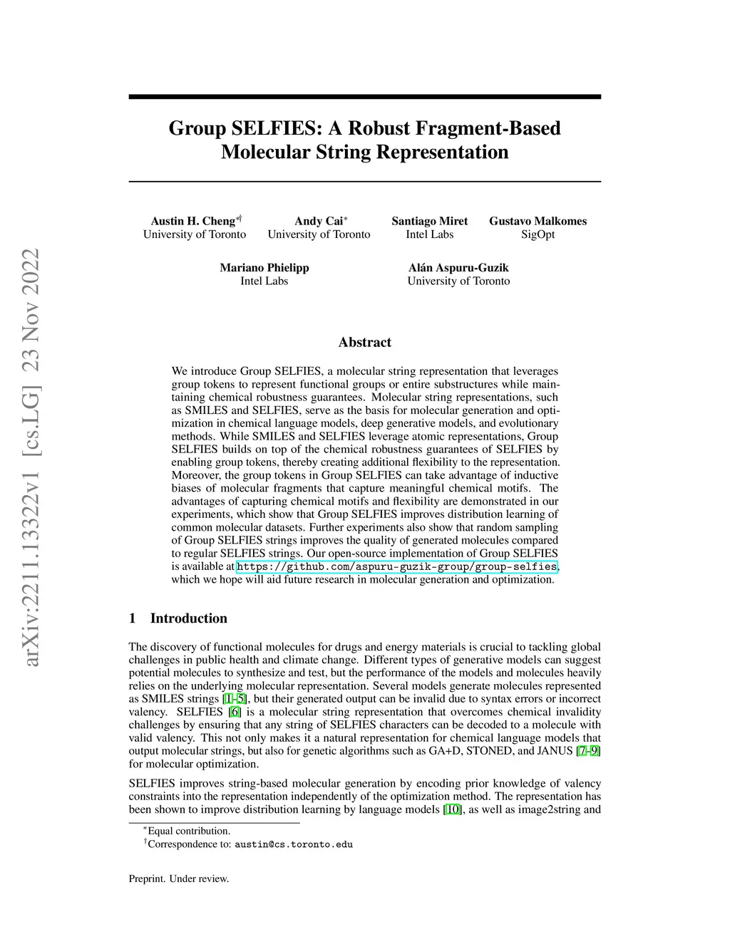 We introduce Group SELFIES, a molecular string representation that leverages group tokens to represent functional groups or entire substructures while maintaining chemical robustness guarantees. Molecular string representations, such as SMILES and SELFIES, serve as the basis for molecular generation and optimization in chemical language models, deep generative models, and evolutionary methods. While SMILES and SELFIES leverage atomic representations, Group SELFIES builds on top of the chemical robustness guarantees of SELFIES by enabling group tokens, thereby creating additional flexibility to the representation. Moreover, the group tokens in Group SELFIES can take advantage of inductive biases of molecular fragments that capture meaningful chemical motifs. The advantages of capturing chemical motifs and flexibility are demonstrated in our experiments, which show that Group SELFIES improves distribution learning of common molecular datasets. Further experiments also show that random sampling of Group SELFIES strings improves the quality of generated molecules compared to regular SELFIES strings. Our open-source implementation of Group SELFIES is available online, which we hope will aid future research in molecular generation and optimization.
