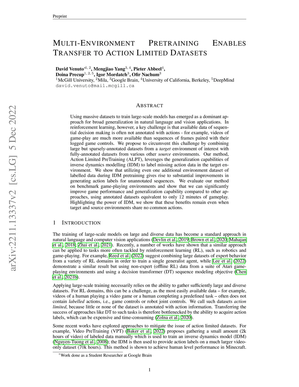 Using massive datasets to train large-scale models has emerged as a dominant approach for broad generalization in natural language and vision applications. In reinforcement learning, however, a key challenge is that available data of sequential decision making is often not annotated with actions - for example, videos of game-play are much more available than sequences of frames paired with their logged game controls. We propose to circumvent this challenge by combining large but sparsely-annotated datasets from a \emph{target} environment of interest with fully-annotated datasets from various other \emph{source} environments. Our method, Action Limited PreTraining (ALPT), leverages the generalization capabilities of inverse dynamics modelling (IDM) to label missing action data in the target environment. We show that utilizing even one additional environment dataset of labelled data during IDM pretraining gives rise to substantial improvements in generating action labels for unannotated sequences. We evaluate our method on benchmark game-playing environments and show that we can significantly improve game performance and generalization capability compared to other approaches, using annotated datasets equivalent to only minutes of gameplay. Highlighting the power of IDM, we show that these benefits remain even when target and source environments share no common actions.