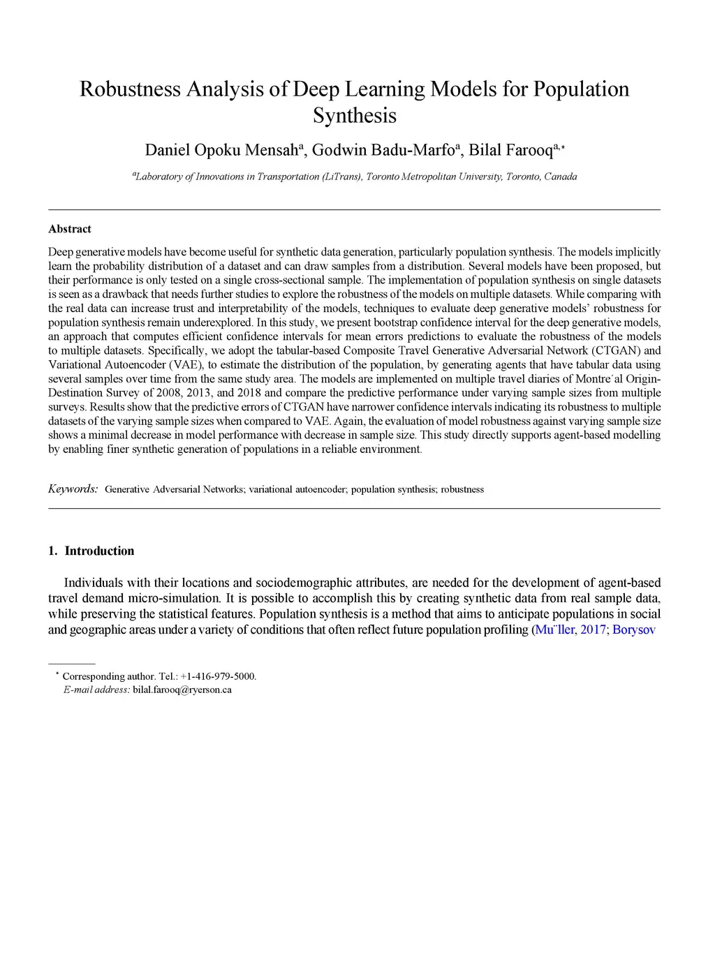 Deep generative models have become useful for synthetic data generation, particularly population synthesis. The models implicitly learn the probability distribution of a dataset and can draw samples from a distribution. Several models have been proposed, but their performance is only tested on a single cross-sectional sample. The implementation of population synthesis on single datasets is seen as a drawback that needs further studies to explore the robustness of the models on multiple datasets. While comparing with the real data can increase trust and interpretability of the models, techniques to evaluate deep generative models' robustness for population synthesis remain underexplored. In this study, we present bootstrap confidence interval for the deep generative models, an approach that computes efficient confidence intervals for mean errors predictions to evaluate the robustness of the models to multiple datasets. Specifically, we adopt the tabular-based Composite Travel Generative Adversarial Network (CTGAN) and Variational Autoencoder (VAE), to estimate the distribution of the population, by generating agents that have tabular data using several samples over time from the same study area. The models are implemented on multiple travel diaries of Montreal Origin- Destination Survey of 2008, 2013, and 2018 and compare the predictive performance under varying sample sizes from multiple surveys. Results show that the predictive errors of CTGAN have narrower confidence intervals indicating its robustness to multiple datasets of the varying sample sizes when compared to VAE. Again, the evaluation of model robustness against varying sample size shows a minimal decrease in model performance with decrease in sample size. This study directly supports agent-based modelling by enabling finer synthetic generation of populations in a reliable environment.