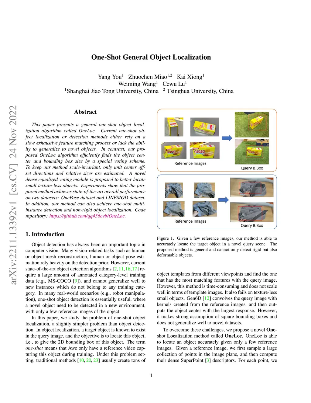 This paper presents a general one-shot object localization algorithm called OneLoc. Current one-shot object localization or detection methods either rely on a slow exhaustive feature matching process or lack the ability to generalize to novel objects. In contrast, our proposed OneLoc algorithm efficiently finds the object center and bounding box size by a special voting scheme. To keep our method scale-invariant, only unit center offset directions and relative sizes are estimated. A novel dense equalized voting module is proposed to better locate small texture-less objects. Experiments show that the proposed method achieves state-of-the-art overall performance on two datasets: OnePose dataset and LINEMOD dataset. In addition, our method can also achieve one-shot multi-instance detection and non-rigid object localization. Code repository: https://github.com/qq456cvb/OneLoc.
