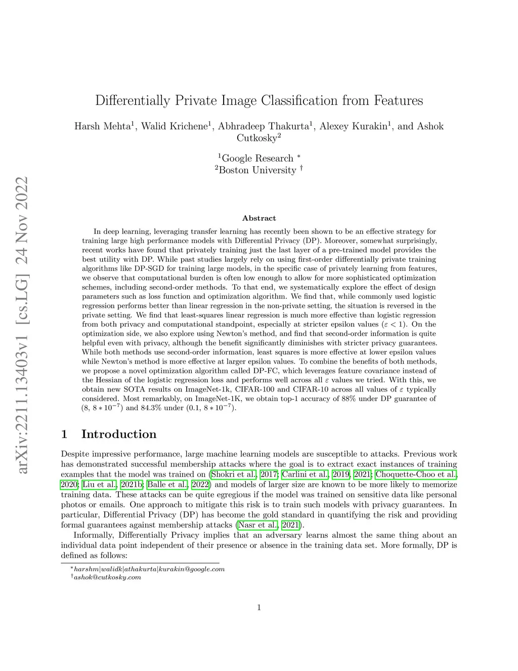 Differentially Private Image Classification from Features