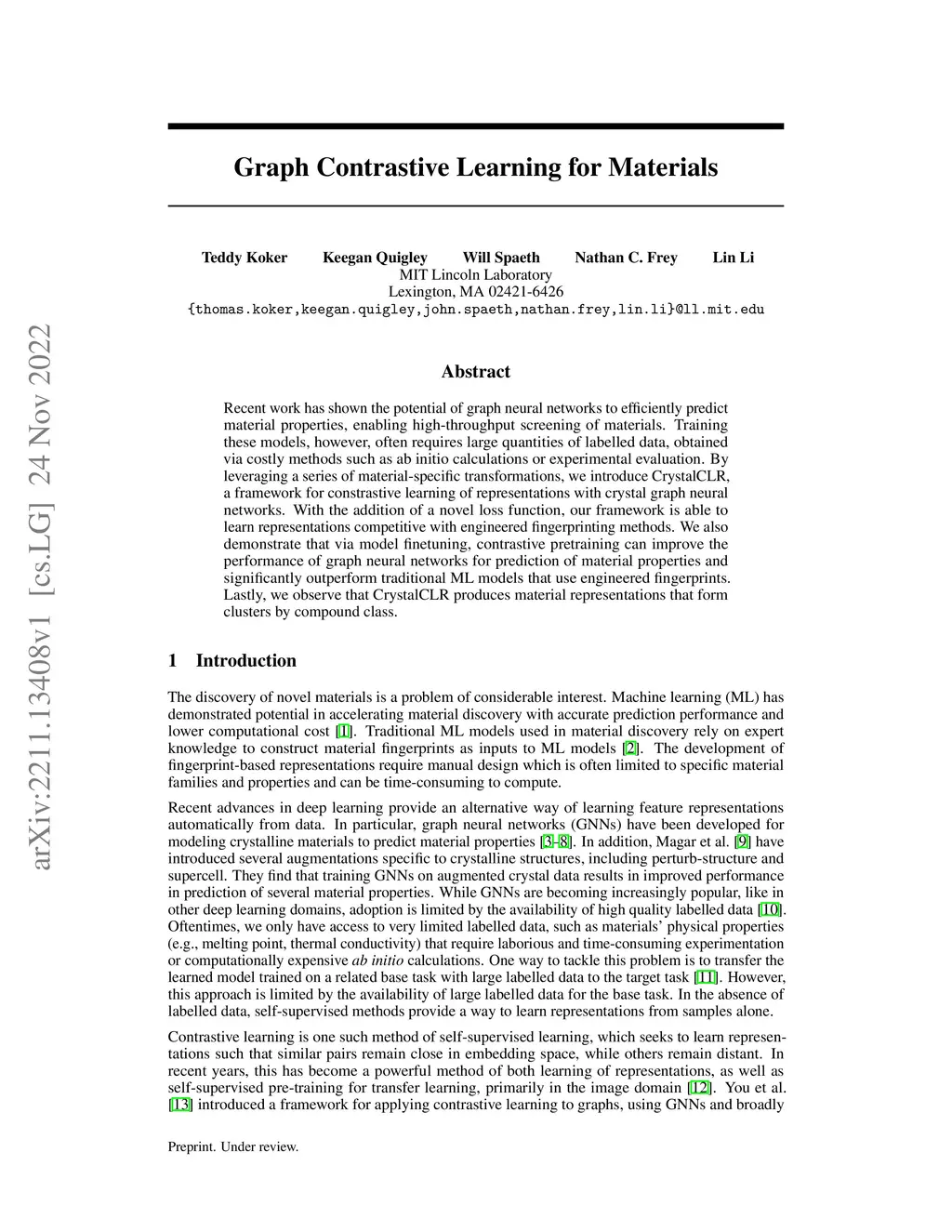 Recent work has shown the potential of graph neural networks to efficiently predict material properties, enabling high-throughput screening of materials. Training these models, however, often requires large quantities of labelled data, obtained via costly methods such as ab initio calculations or experimental evaluation. By leveraging a series of material-specific transformations, we introduce CrystalCLR, a framework for constrastive learning of representations with crystal graph neural networks. With the addition of a novel loss function, our framework is able to learn representations competitive with engineered fingerprinting methods. We also demonstrate that via model finetuning, contrastive pretraining can improve the performance of graph neural networks for prediction of material properties and significantly outperform traditional ML models that use engineered fingerprints. Lastly, we observe that CrystalCLR produces material representations that form clusters by compound class.