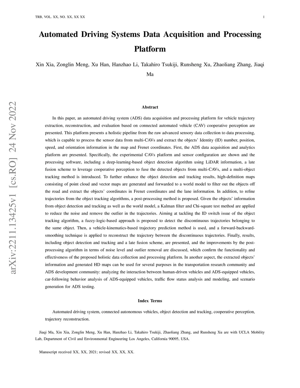 This paper presents an automated driving system (ADS) data acquisition and processing platform for vehicle trajectory extraction, reconstruction, and evaluation based on connected automated vehicle (CAV) cooperative perception. This platform presents a holistic pipeline from the raw advanced sensory data collection to data processing, which can process the sensor data from multiple CAVs and extract the objects' Identity (ID) number, position, speed, and orientation information in the map and Frenet coordinates. First, the ADS data acquisition and analytics platform are presented. Specifically, the experimental CAVs platform and sensor configuration are shown, and the processing software, including a deep-learning-based object detection algorithm using LiDAR information, a late fusion scheme to leverage cooperative perception to fuse the detected objects from multiple CAVs, and a multi-object tracking method is introduced. To further enhance the object detection and tracking results, high definition maps consisting of point cloud and vector maps are generated and forwarded to a world model to filter out the objects off the road and extract the objects' coordinates in Frenet coordinates and the lane information. In addition, a post-processing method is proposed to refine trajectories from the object tracking algorithms. Aiming to tackle the ID switch issue of the object tracking algorithm, a fuzzy-logic-based approach is proposed to detect the discontinuous trajectories of the same object. Finally, results, including object detection and tracking and a late fusion scheme, are presented, and the post-processing algorithm's improvements in noise level and outlier removal are discussed, confirming the functionality and effectiveness of the proposed holistic data collection and processing platform.