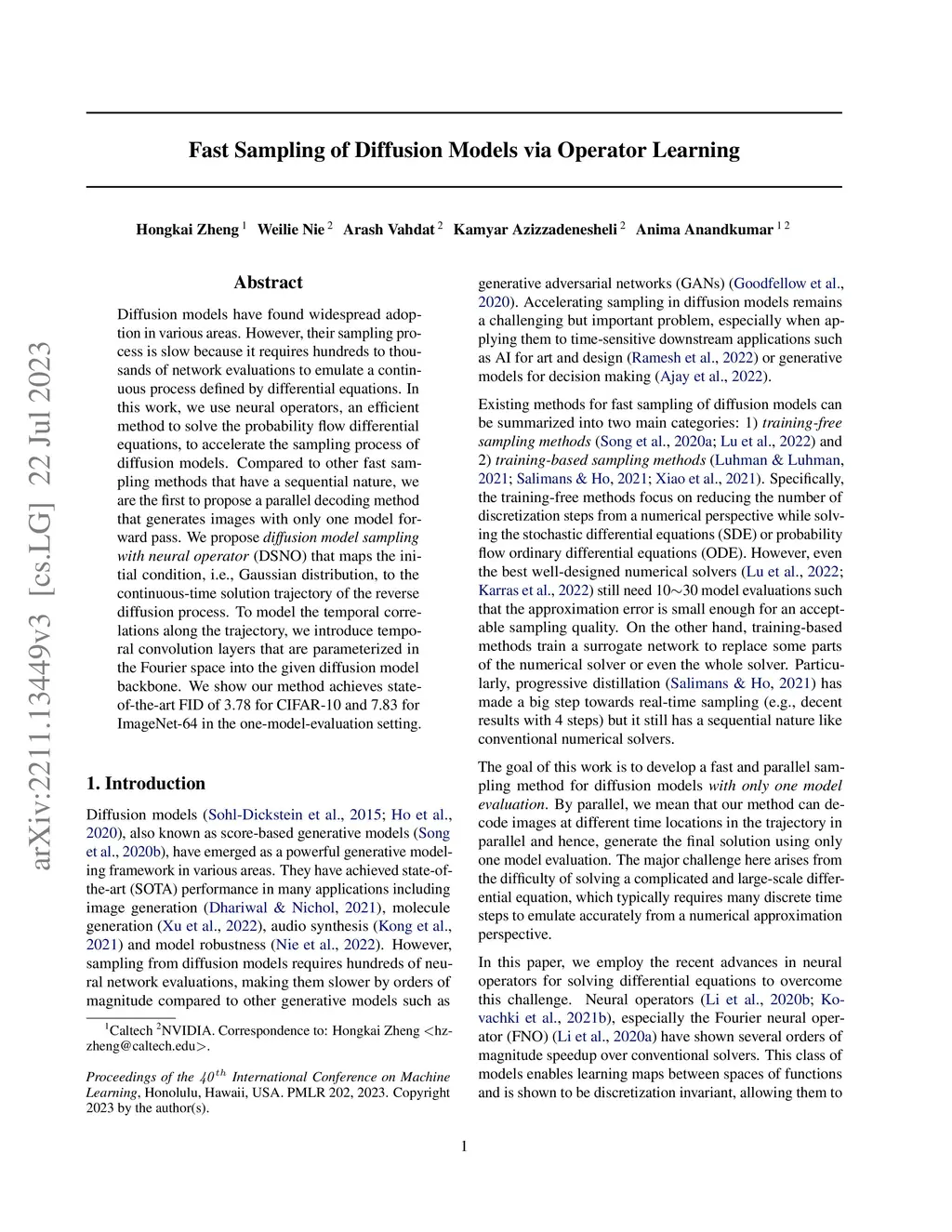 Diffusion models have found widespread adoption in various areas. However, their sampling process is slow because it requires hundreds to thousands of network evaluations to emulate a continuous process defined by differential equations. In this work, we use neural operators, an efficient method to solve the probability flow differential equations, to accelerate the sampling process of diffusion models. Compared to other fast sampling methods that have a sequential nature, we are the first to propose a parallel decoding method that generates images with only one model forward pass. We propose diffusion model sampling with neural operator (DSNO) that maps the initial condition, i.e., Gaussian distribution, to the continuous-time solution trajectory of the reverse diffusion process. To model the temporal correlations along the trajectory, we introduce temporal convolution layers that are parameterized in the Fourier space into the given diffusion model backbone. We show our method achieves state-of-the-art FID of 3.78 for CIFAR-10 and 7.83 for ImageNet-64 in the one-model-evaluation setting.