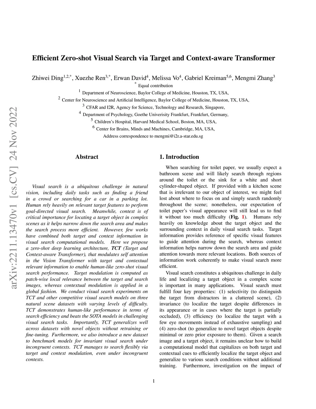 Visual search is a ubiquitous challenge in natural vision, including daily tasks such as finding a friend in a crowd or searching for a car in a parking lot. Human rely heavily on relevant target features to perform goal-directed visual search. Meanwhile, context is of critical importance for locating a target object in complex scenes as it helps narrow down the search area and makes the search process more efficient. However, few works have combined both target and context information in visual search computational models. Here we propose a zero-shot deep learning architecture, TCT (Target and Context-aware Transformer), that modulates self attention in the Vision Transformer with target and contextual relevant information to enable human-like zero-shot visual search performance. Target modulation is computed as patch-wise local relevance between the target and search images, whereas contextual modulation is applied in a global fashion. We conduct visual search experiments on TCT and other competitive visual search models on three natural scene datasets with varying levels of difficulty. TCT demonstrates human-like performance in terms of search efficiency and beats the SOTA models in challenging visual search tasks. Importantly, TCT generalizes well across datasets with novel objects without retraining or fine-tuning. Furthermore, we also introduce a new dataset to benchmark models for invariant visual search under incongruent contexts. TCT manages to search flexibly via target and context modulation, even under incongruent contexts.