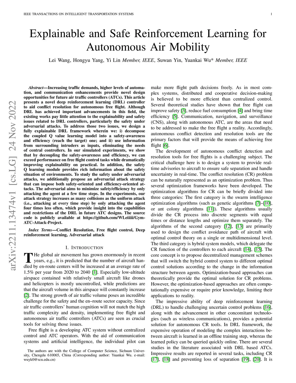 Increasing traffic demands, higher levels of automation, and communication enhancements provide novel design opportunities for future air traffic controllers (ATCs). This article presents a novel deep reinforcement learning (DRL) controller to aid conflict resolution for autonomous free flight. Although DRL has achieved important advancements in this field, the existing works pay little attention to the explainability and safety issues related to DRL controllers, particularly the safety under adversarial attacks. To address those two issues, we design a fully explainable DRL framework wherein we: 1) decompose the coupled Q value learning model into a safety-awareness and efficiency (reach the target) one; and 2) use information from surrounding intruders as inputs, eliminating the needs of central controllers. In our simulated experiments, we show that by decoupling the safety-awareness and efficiency, we can exceed performance on free flight control tasks while dramatically improving explainability on practical. In addition, the safety Q learning module provides rich information about the safety situation of environments. To study the safety under adversarial attacks, we additionally propose an adversarial attack strategy that can impose both safety-oriented and efficiency-oriented attacks. The adversarial aims to minimize safety/efficiency by only attacking the agent at a few time steps. In the experiments, our attack strategy increases as many collisions as the uniform attack (i.e., attacking at every time step) by only attacking the agent four times less often, which provide insights into the capabilities and restrictions of the DRL in future ATC designs. The source code is publicly available at https://github.com/WLeiiiii/Gym-ATC-Attack-Project.
