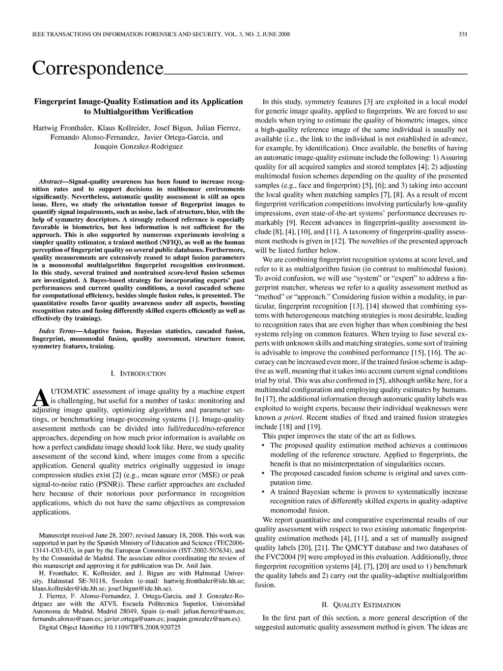 Fingerprint Image-Quality Estimation and its Application to