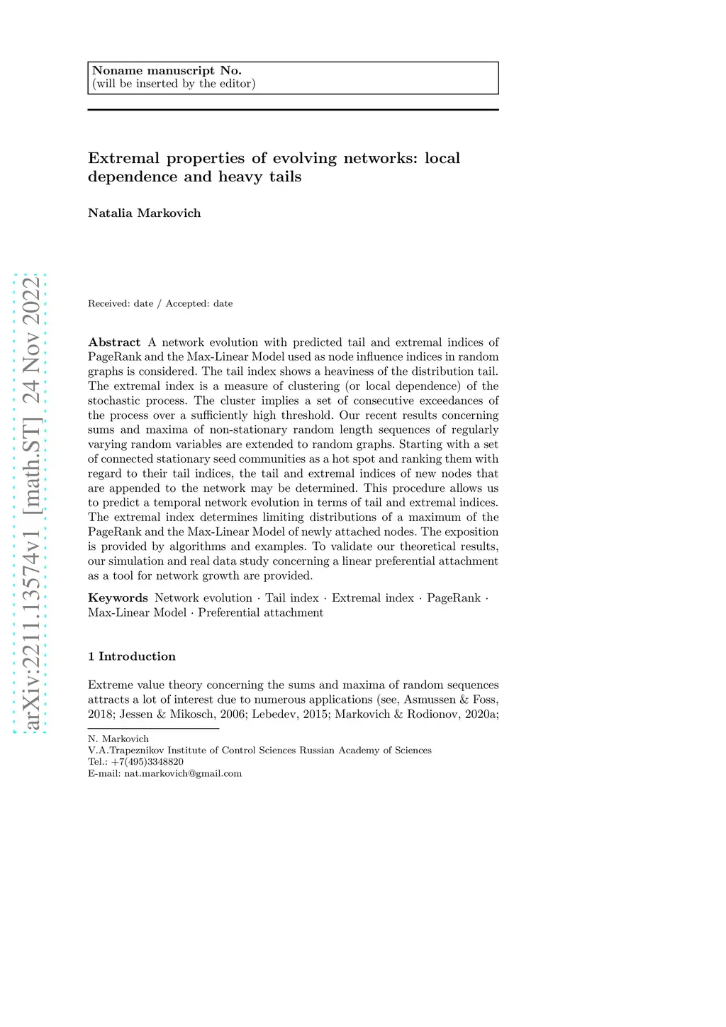 A network evolution with predicted tail and extremal indices of PageRank and the Max-Linear Model used as node influence indices in random graphs is considered. The tail index shows a heaviness of the distribution tail. The extremal index is a measure of clustering (or local dependence) of the stochastic process. The cluster implies a set of consecutive exceedances of the process over a sufficiently high threshold. Our recent results concerning sums and maxima of non-stationary random length sequences of regularly varying random variables are extended to random graphs. Starting with a set of connected stationary seed communities as a hot spot and ranking them with regard to their tail indices, the tail and extremal indices of new nodes that are appended to the network may be determined. This procedure allows us to predict a temporal network evolution in terms of tail and extremal indices. The extremal index determines limiting distributions of a maximum of the PageRank and the Max-Linear Model of newly attached nodes. The exposition is provided by algorithms and examples. To validate our theoretical results, our simulation and real data study concerning a linear preferential attachment as a tool for network growth are provided.