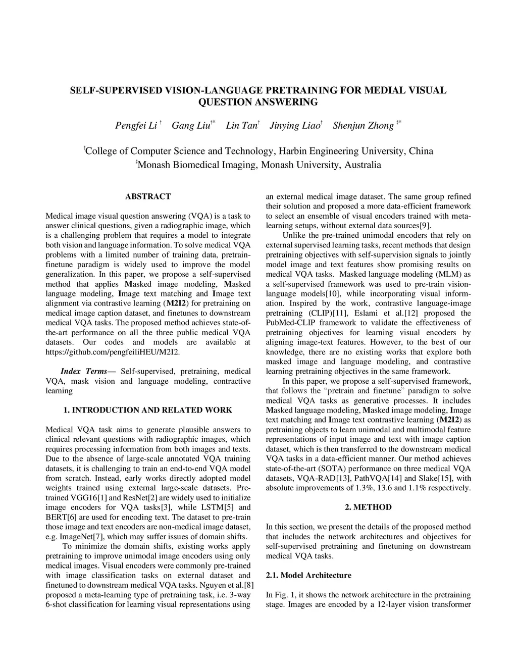 Medical image visual question answering (VQA) is a task to answer clinical questions, given a radiographic image, which is a challenging problem that requires a model to integrate both vision and language information. To solve medical VQA problems with a limited number of training data, pretrain-finetune paradigm is widely used to improve the model generalization. In this paper, we propose a self-supervised method that applies Masked image modeling, Masked language modeling, Image text matching and Image text alignment via contrastive learning (M2I2) for pretraining on medical image caption dataset, and finetunes to downstream medical VQA tasks. The proposed method achieves state-of-the-art performance on all the three public medical VQA datasets. Our codes and models are available at https://github.com/pengfeiliHEU/M2I2.